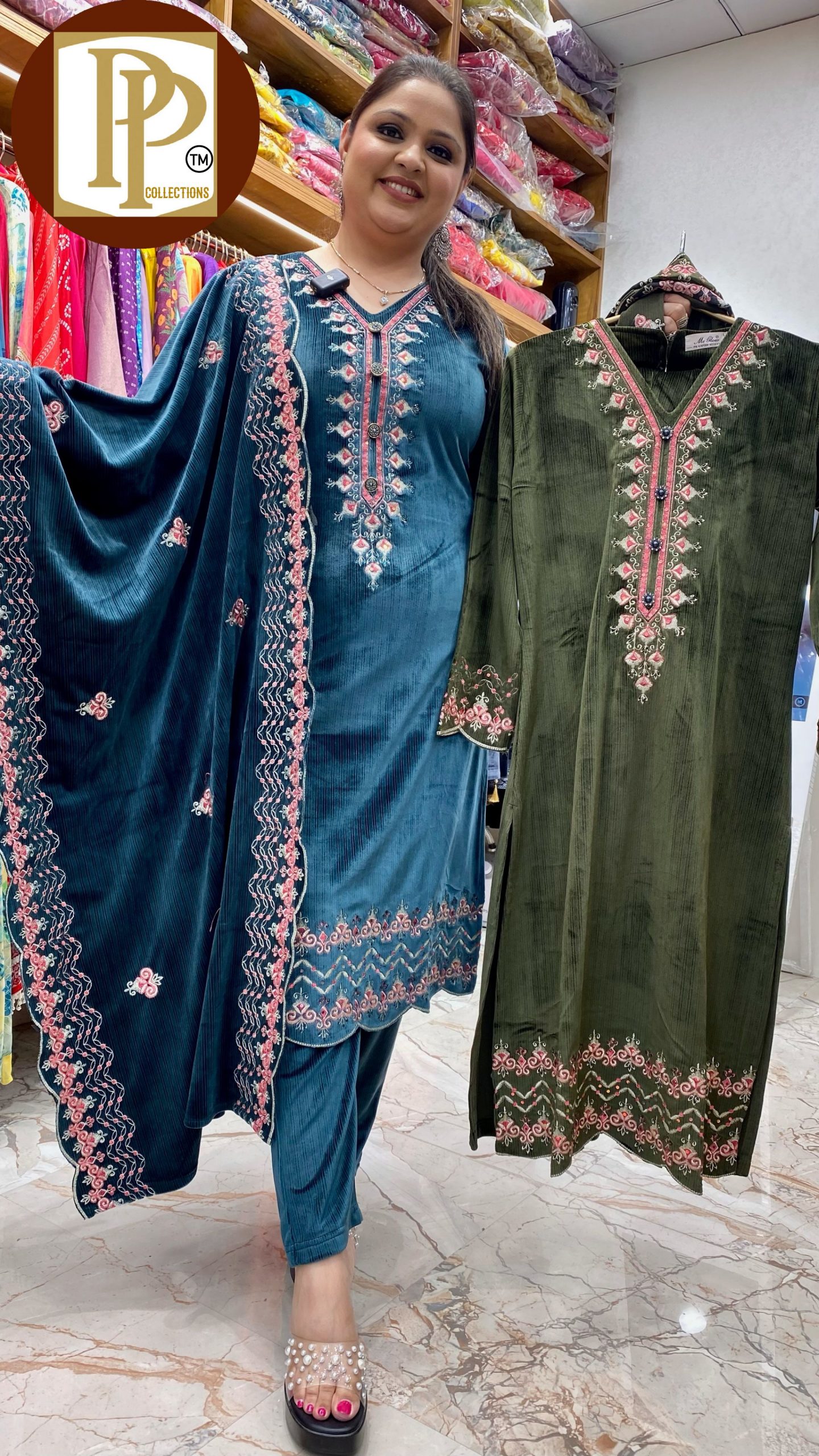 Description : 3piece set Fabric Type : Velvet Style : Stright Set Work Type : Thread & Shiroski Ston Work With Matching Shawl.