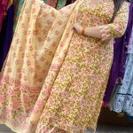 Out of StockAttractive cotton 3pc pant set with thread work on upper part & block print pattern on all over the kurta with matching print pattern on pants with matching print on cotton dupatta.