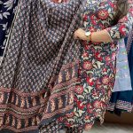 Attractive 3pc cotton pant set with thread & foil mirror work on upper part with block print pattern on all over the kurta with matching print pants & dupatta.