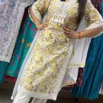 Attractive 3pc cotton pant set with hand & laces work on upper part with block print pattern on all over the kurta with matching laces borders on kurta & pant borders with matching dupatta.