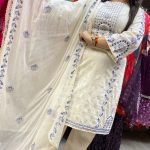Attractive 3pc cotton pant set with hand & thread work on all over the kurta with matching work on pant & matching cotton dupatta.
