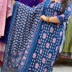 Attractive 3pc cotton pant set with organza laces work on v-neck of kurta with matching print pattern on all over the kurta, pant & dupatta.