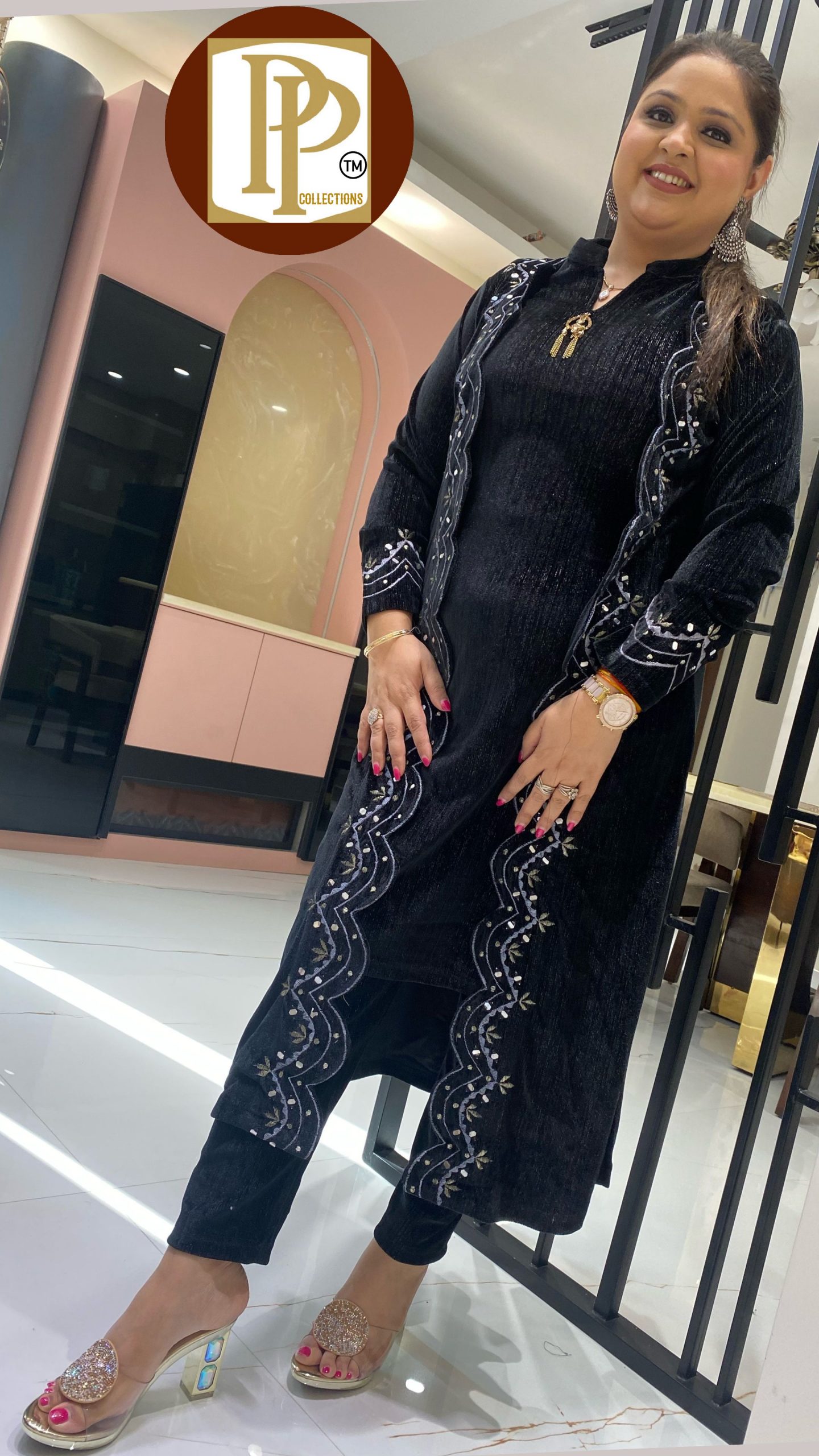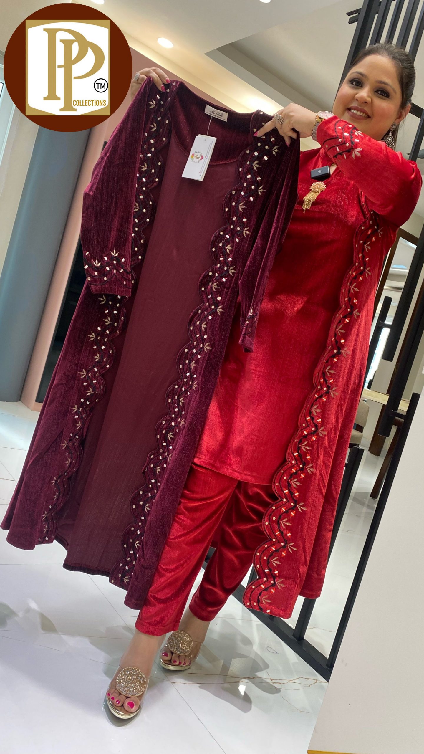 Description : 3piece Pant Set Fabric Type : Velvet Style : Plain Inner & Pant Co-ord Sets Co-ord Sets Work Type : Thread & Original Mirror Work on Shrug.