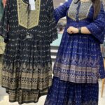 Attractive rayon 3pc peplum sharara set with thread work on upper part with print pattern all over the kurta, sharara & dupatta.