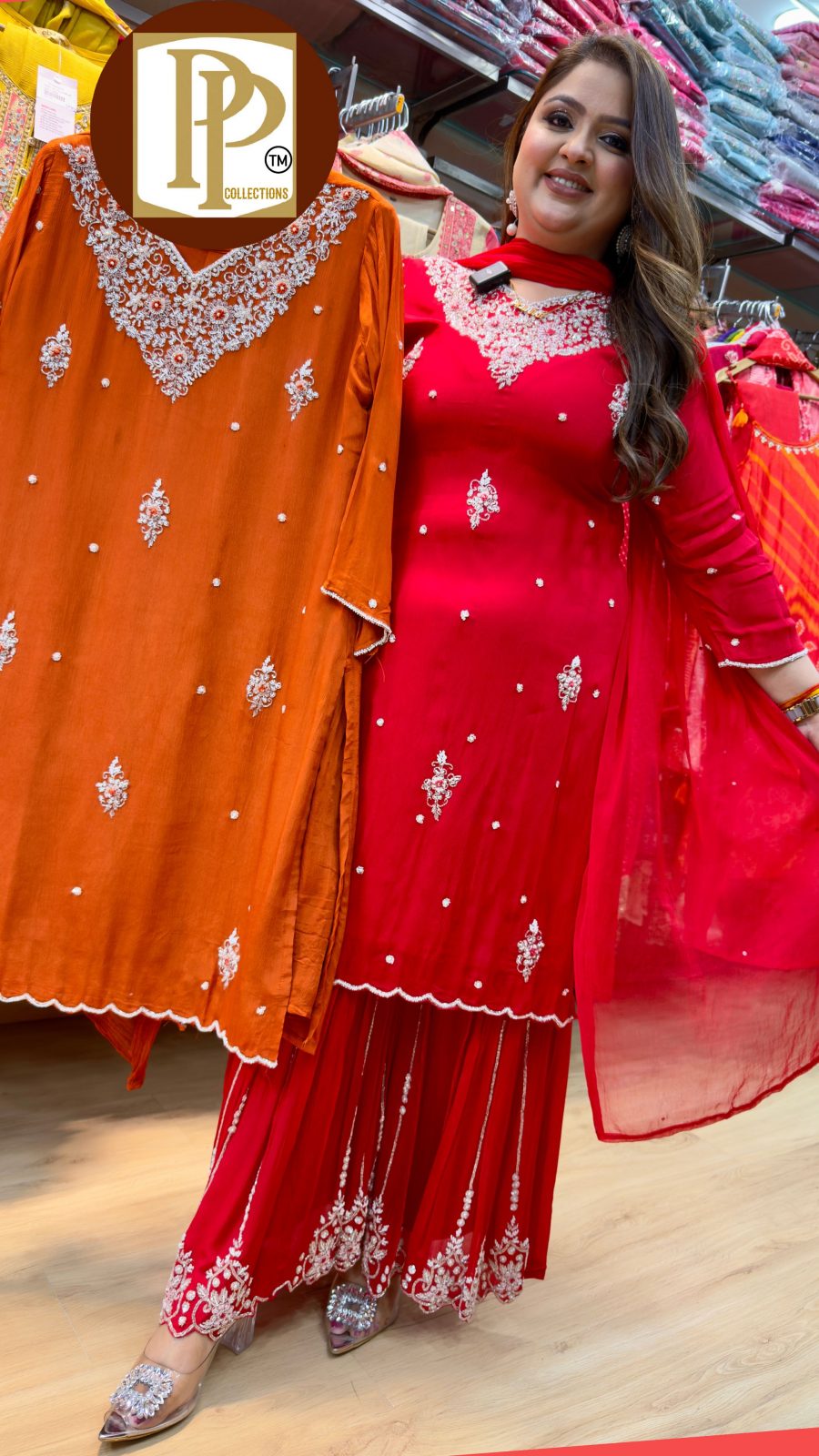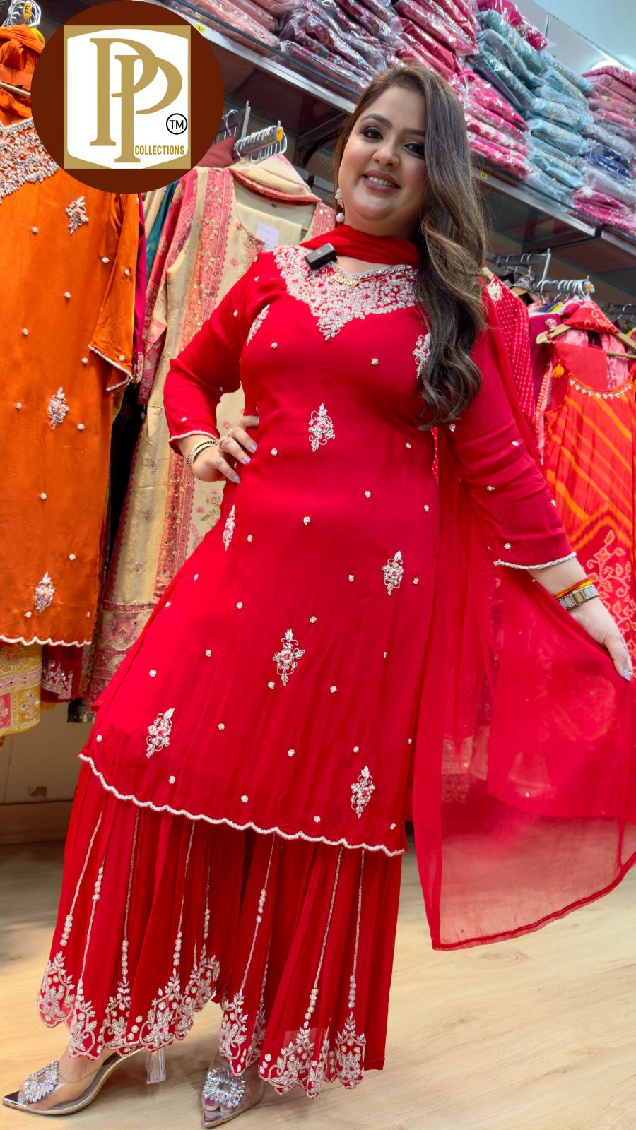 Description : 3piece Gharara Set Fabric Type : Chinnon Style : Kurta & Gharara Set Work Type : Full Havey Hand Work With Matching Dupatta.