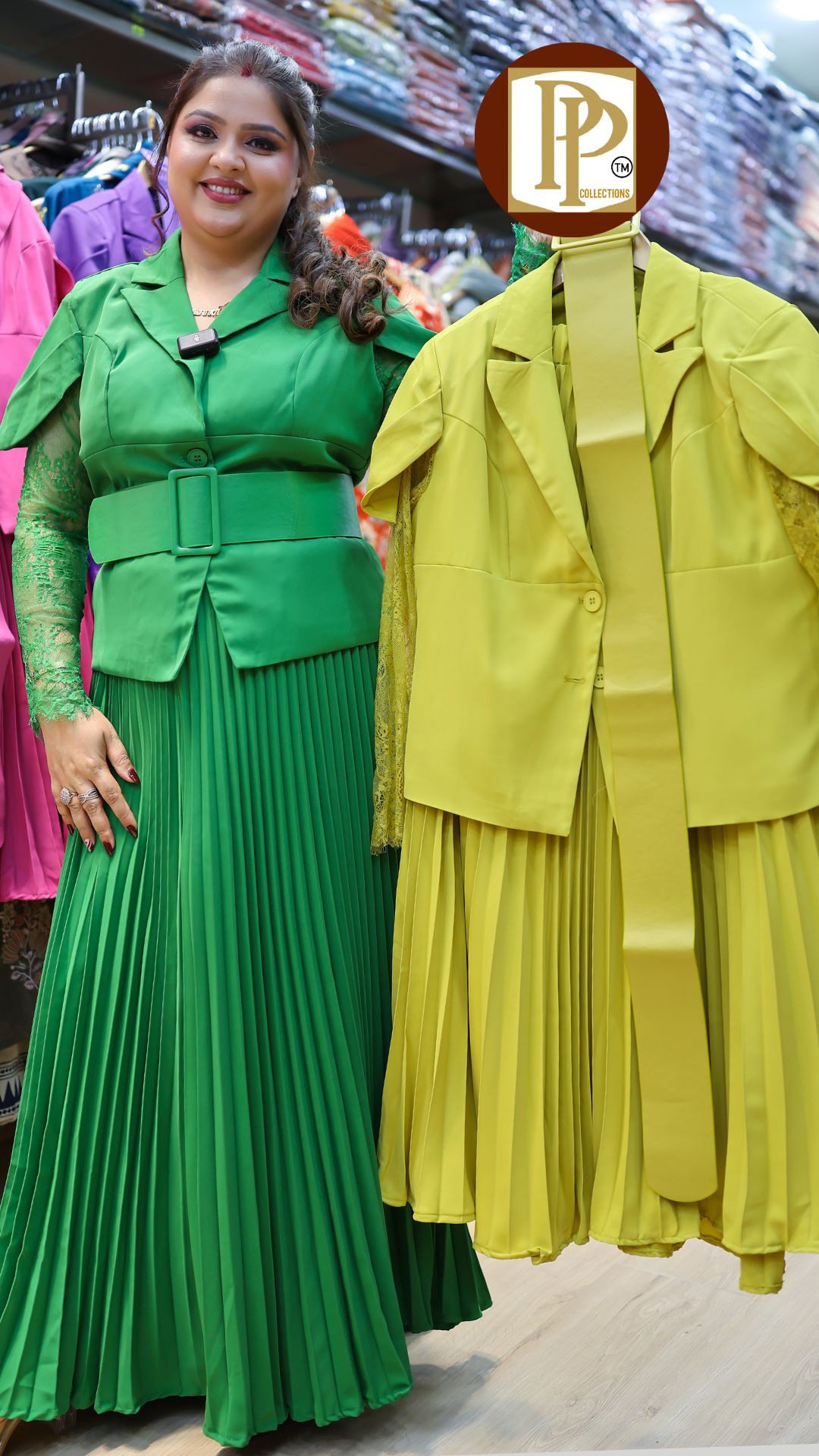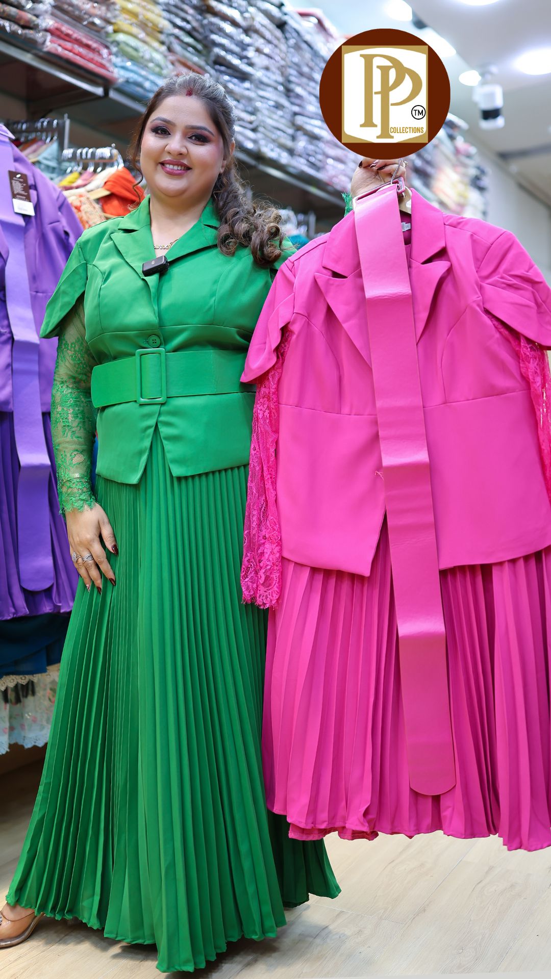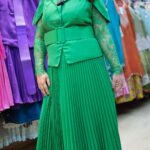 Work Type : all over plain matching jacket with belt & Matching skirt .