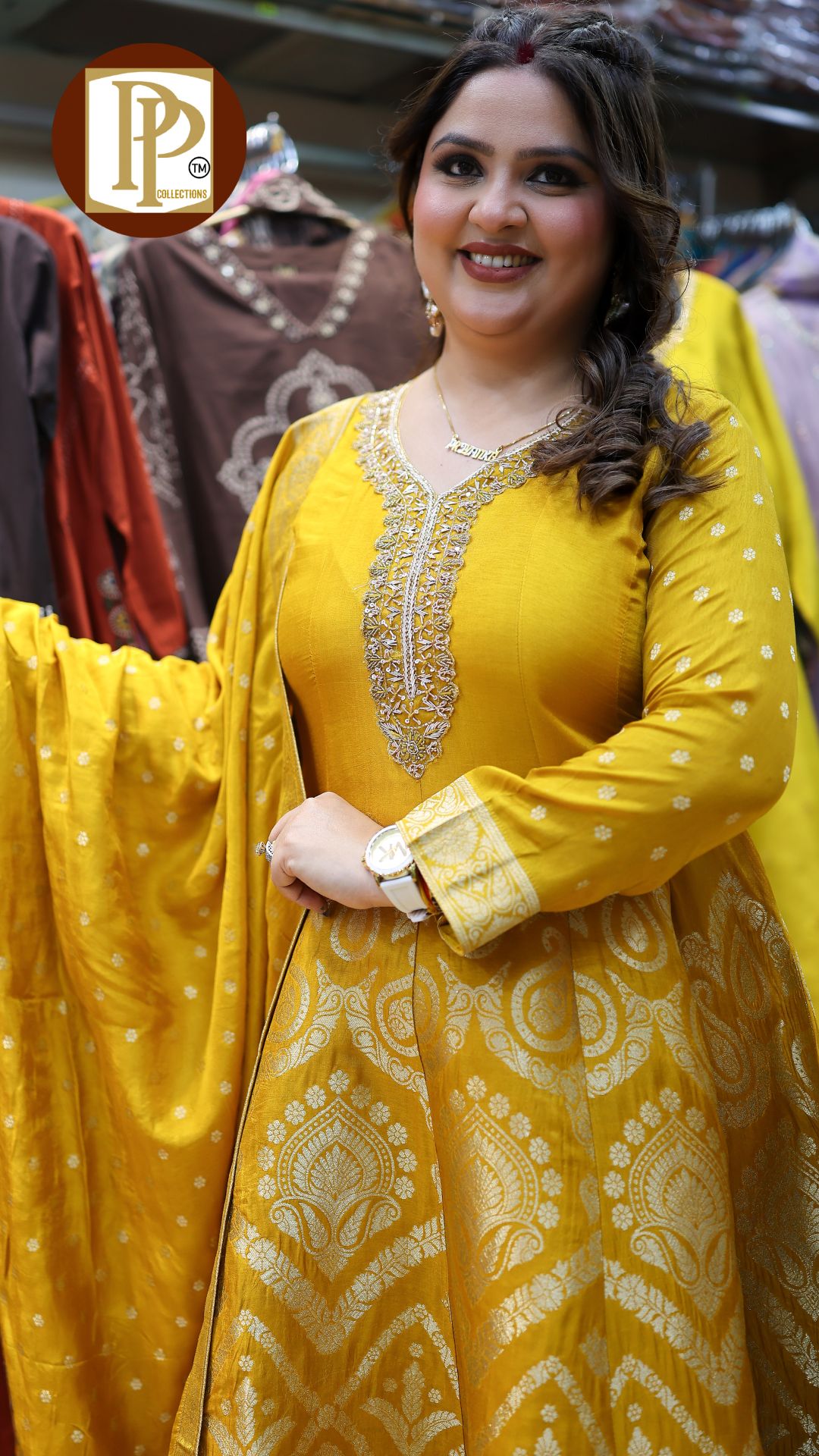 Description : 3pcs Pant Set Fabric Type : Silk Style : Anarkali with pants Work Type : Jacquard Print On Hand Work With Matching Banarasi Dupatta. w011