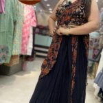 Attractive 2pc georgette designer dress with hand work on all over the crop top with matching print pattern on attached drape with matching hand work on complementary belt.