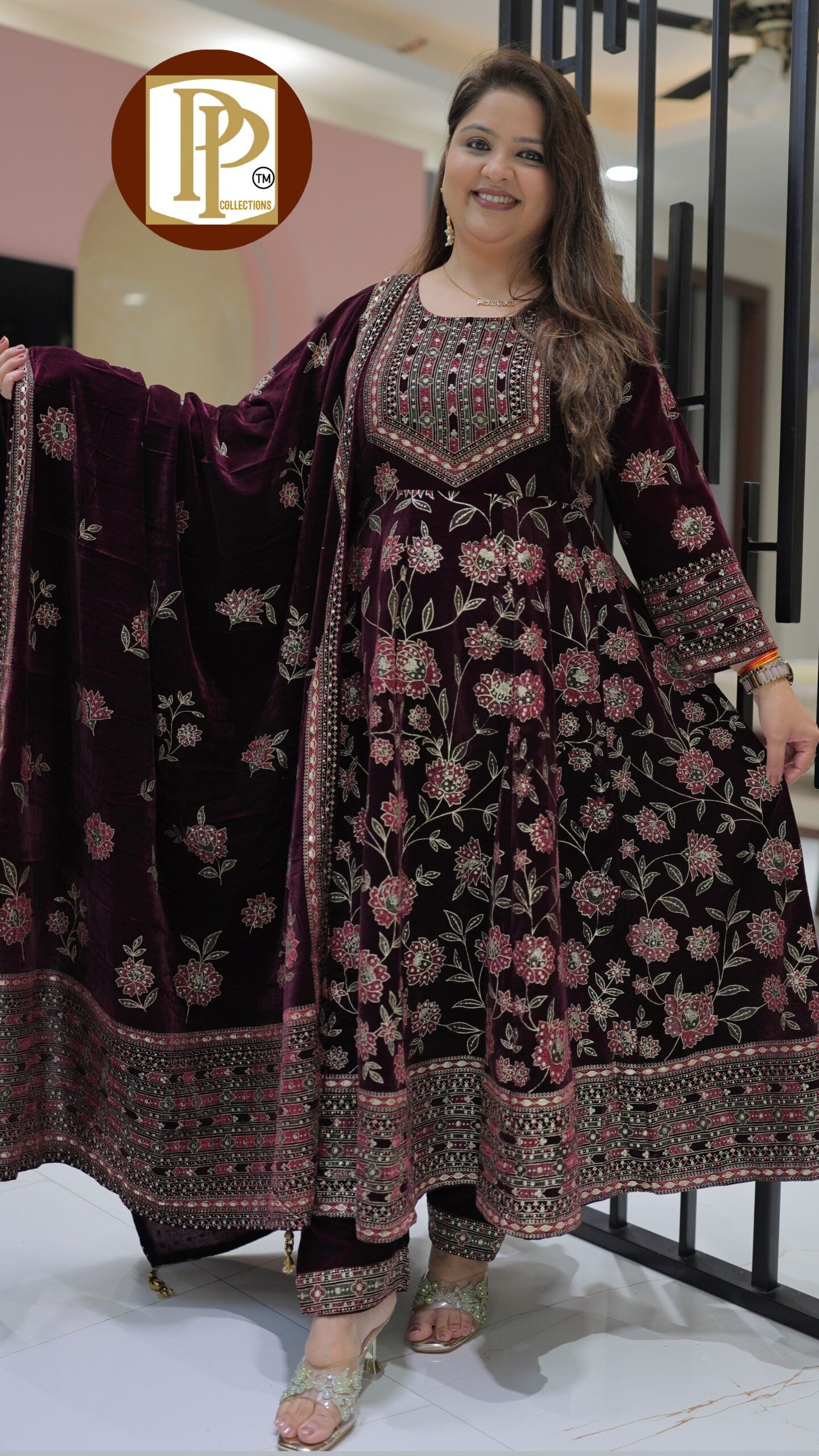 Description : 3pcs Anarkali set Fabric Type : velvet Style : shawl with Anarkali Work Type : full emboss print in an Anarkali & matching shawl and pants .