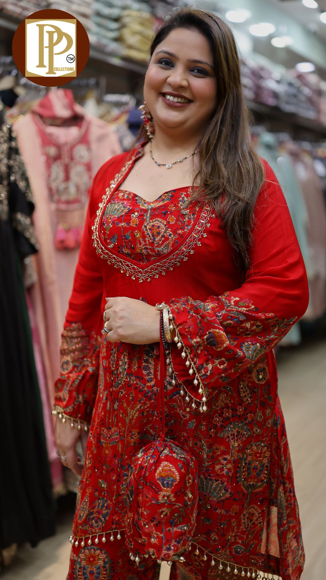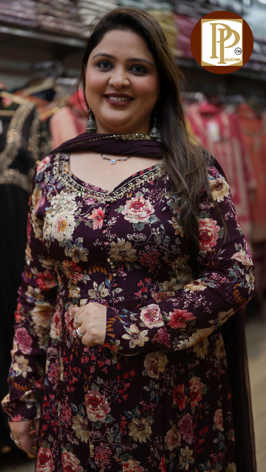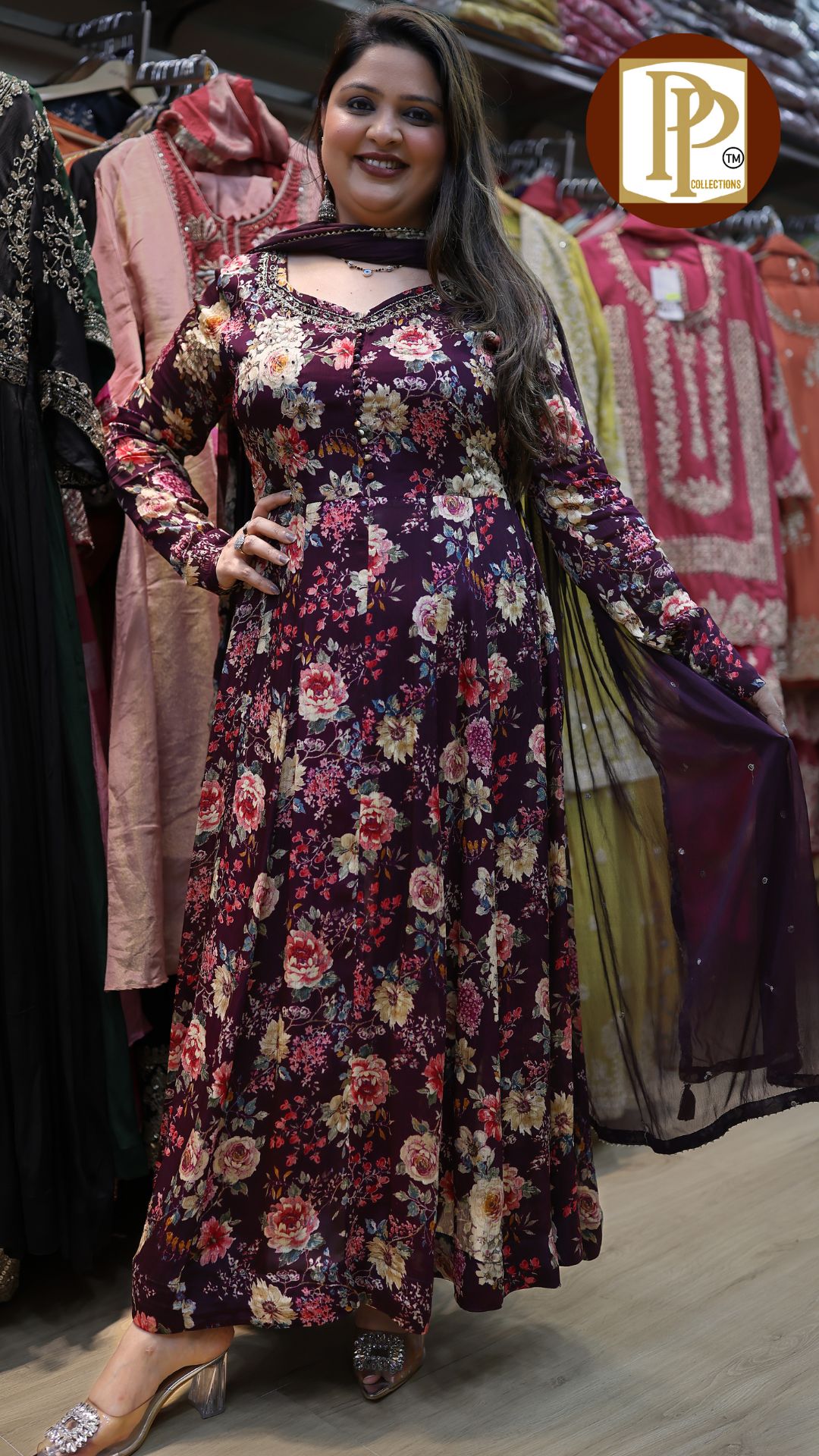 Description : 3pcs anarkali set Fabric Type : chinnon Style : buckram anarkali with pants Work Type : all over printed anarkali handwork in neck with matching pants & dupatta .