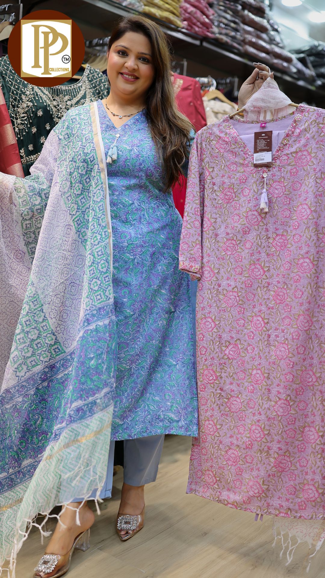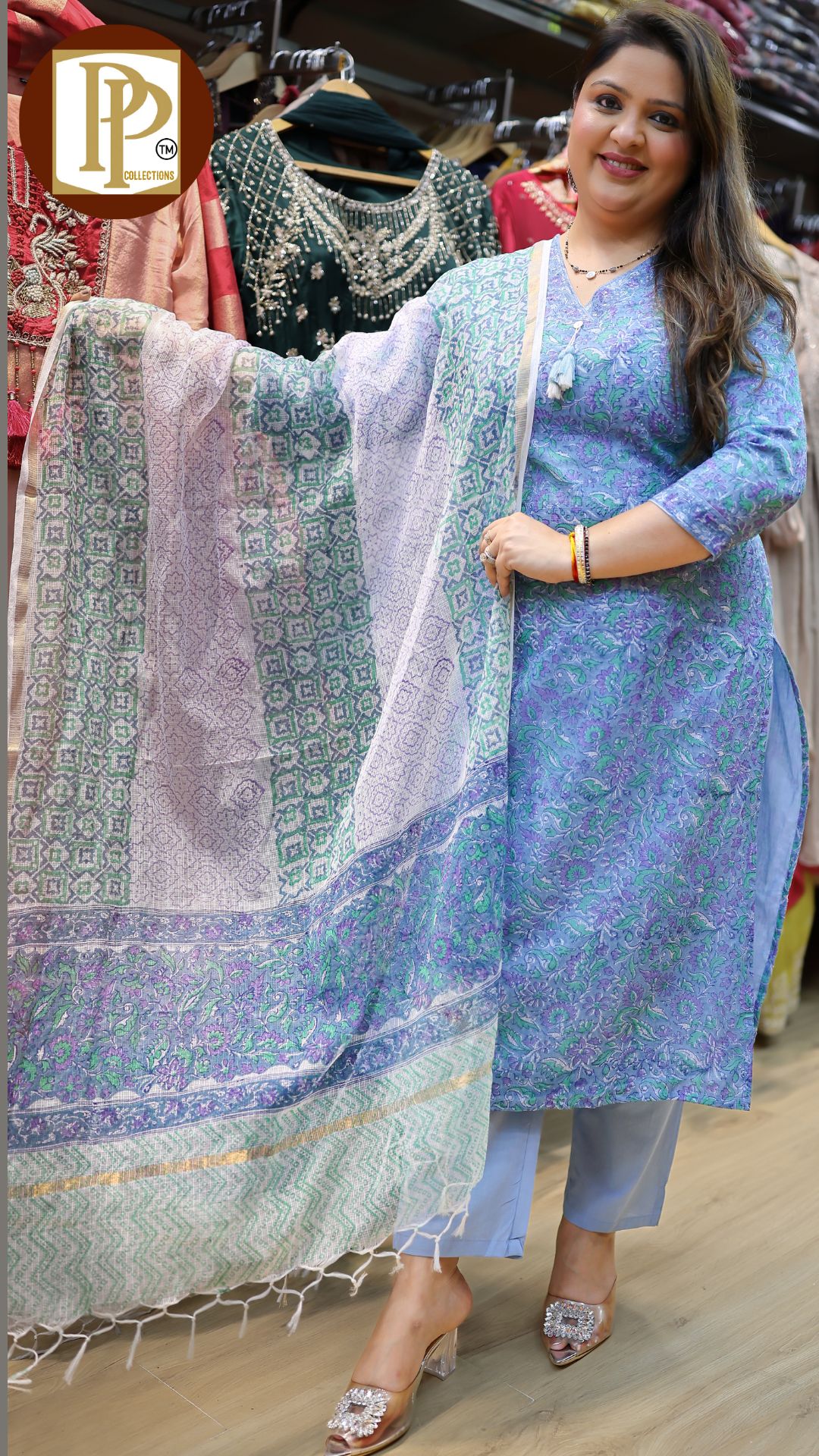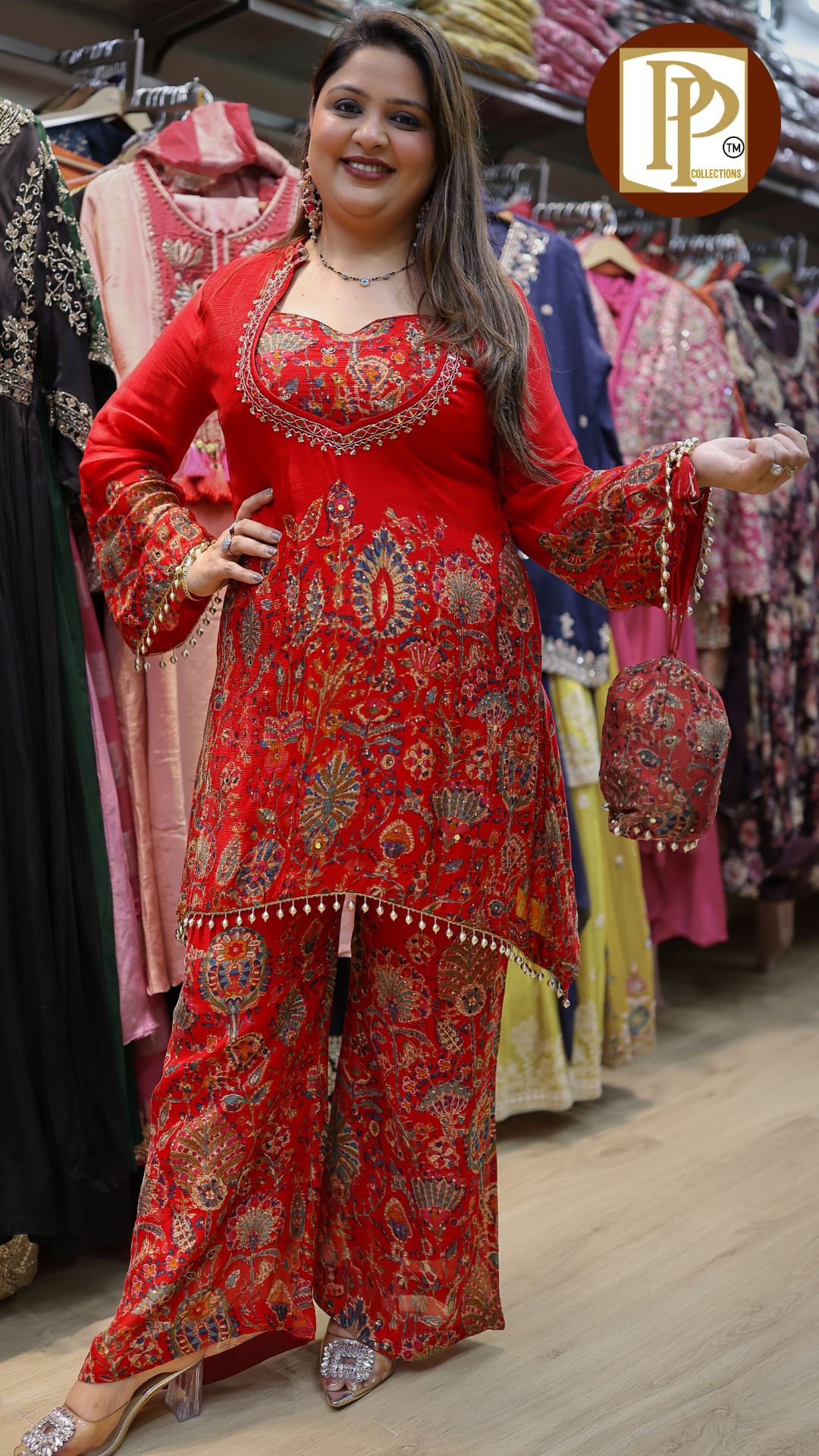 Description : 3pcs anarkali set Fabric Type : chinnon Style : buckram anarkali with pants Work Type : all over printed anarkali handwork in neck with matching pants & dupatta .