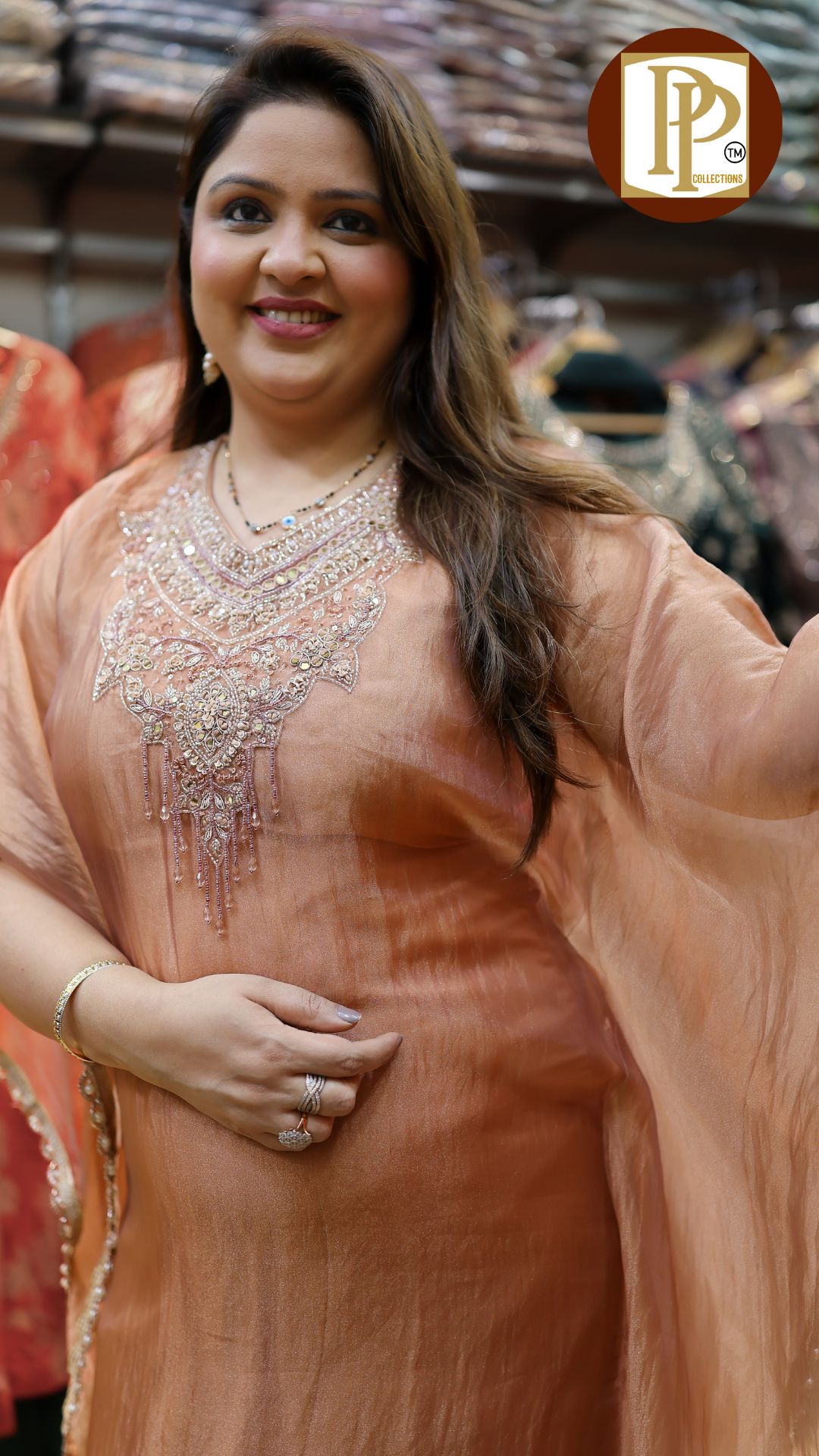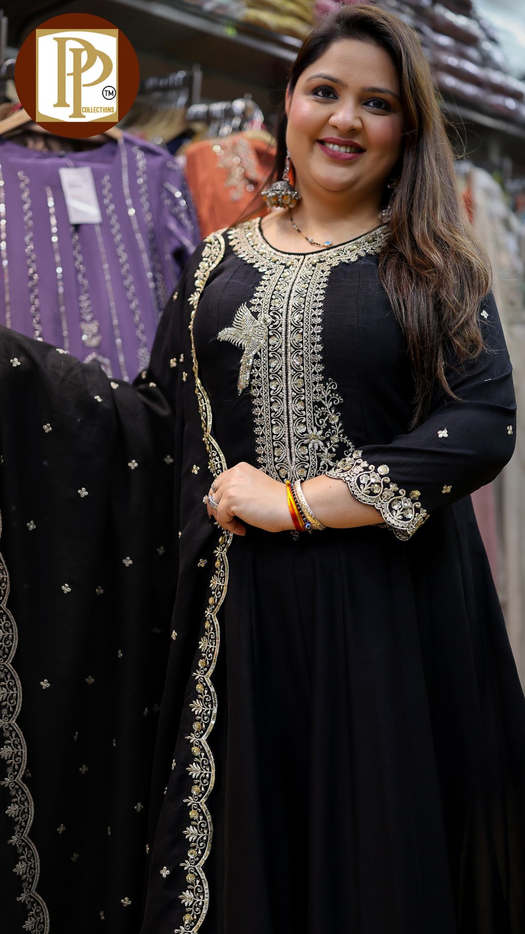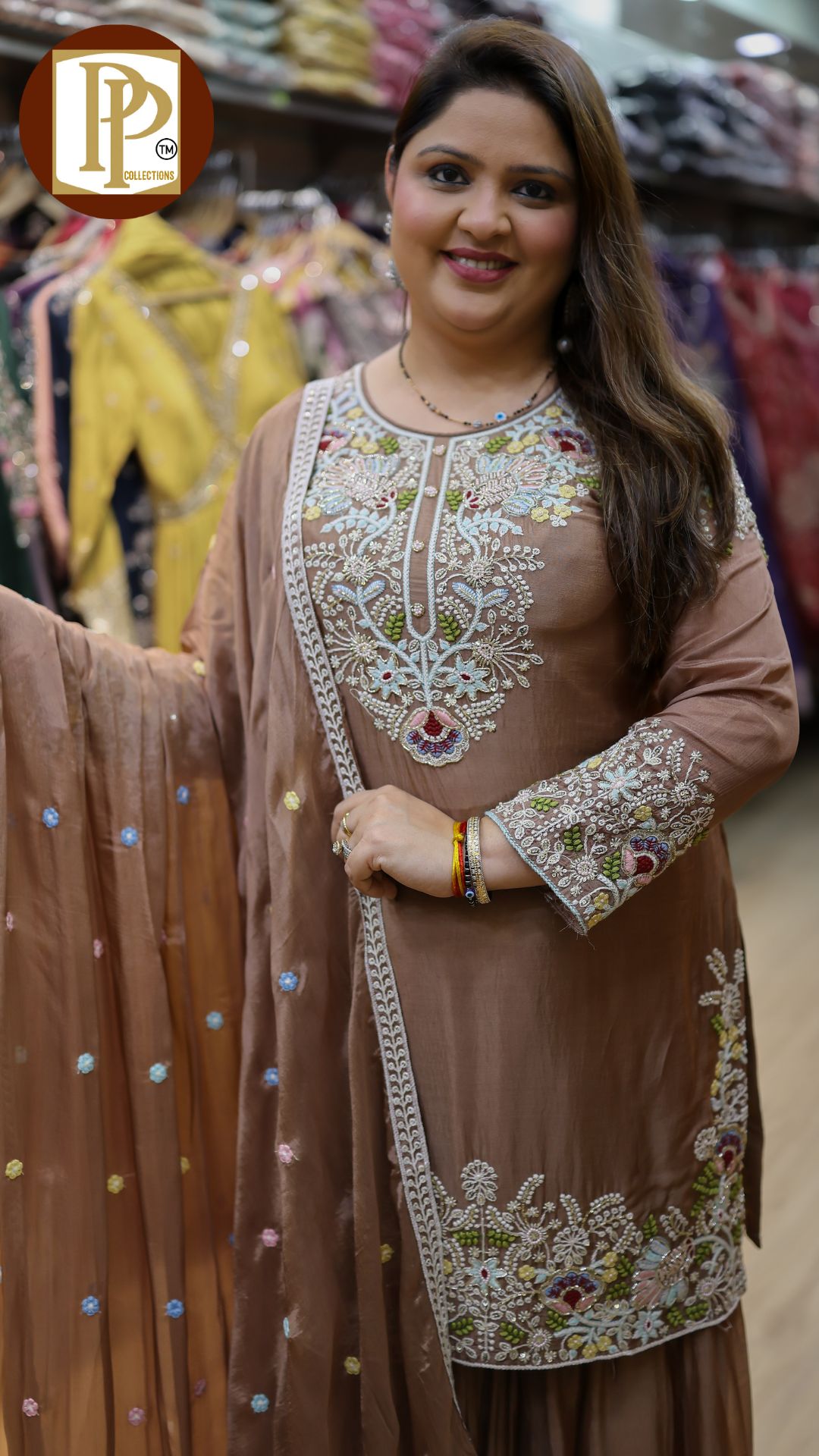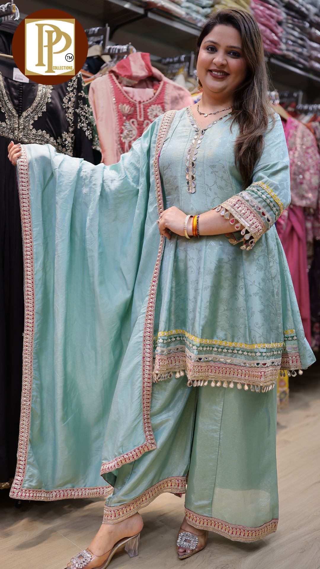 Description : 3pcs divider set Fabric Type : tissue Style : short umbrella style anarkali with divider Work Type : self work original mirror work laces work with matching divider & duppata .