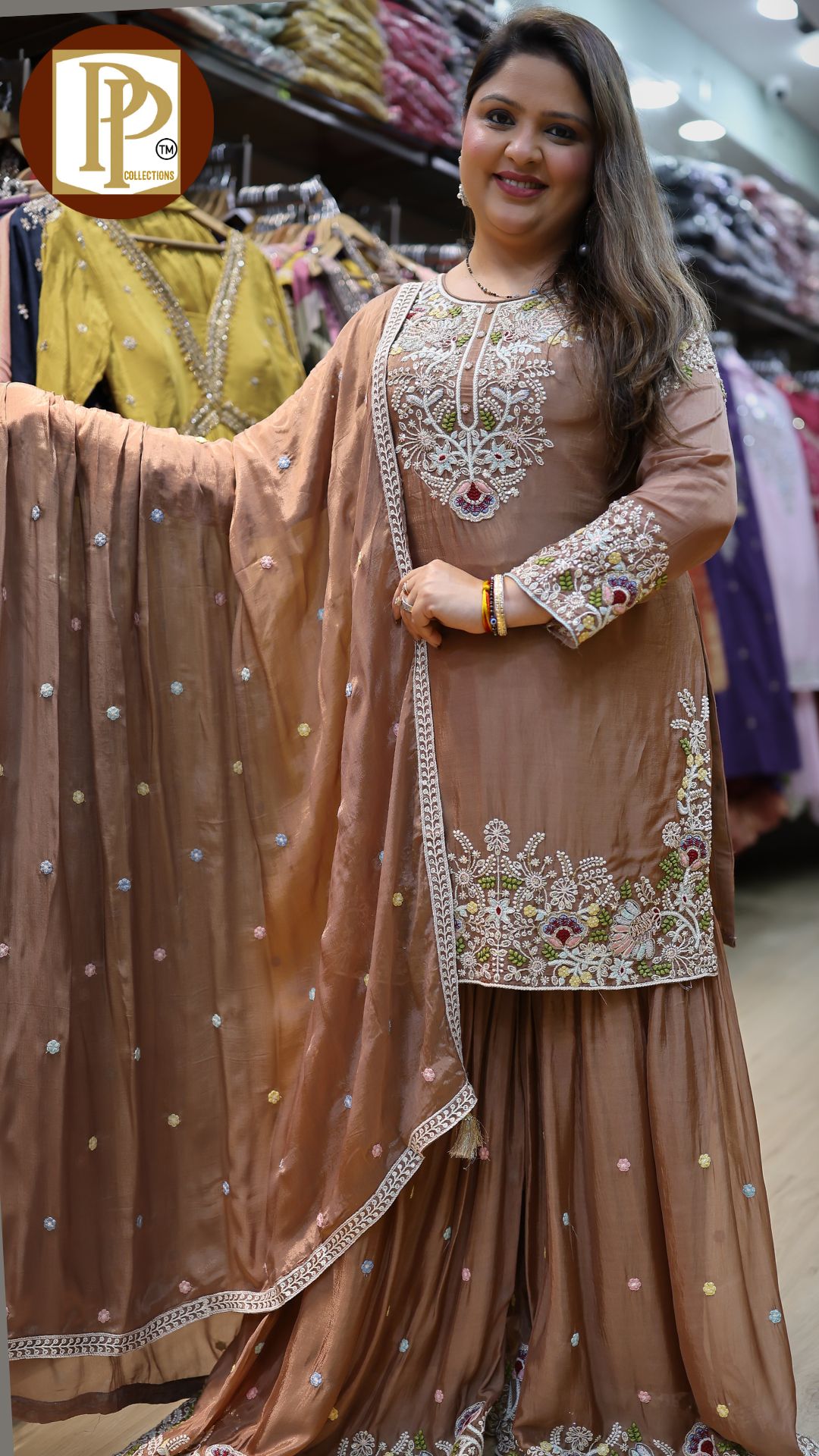 Description : 3pcs Garara set Fabric Type : chinnon Style : kurta with garara Work Type : heavy handwork threadwork in kurta with matching garara & dupatta .