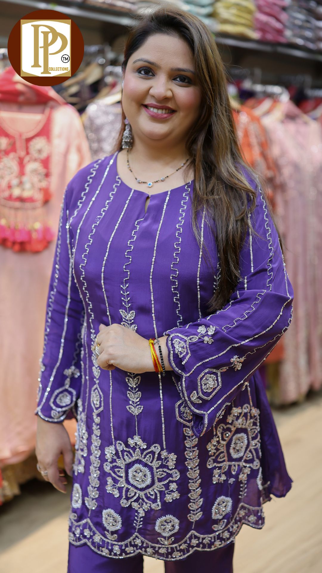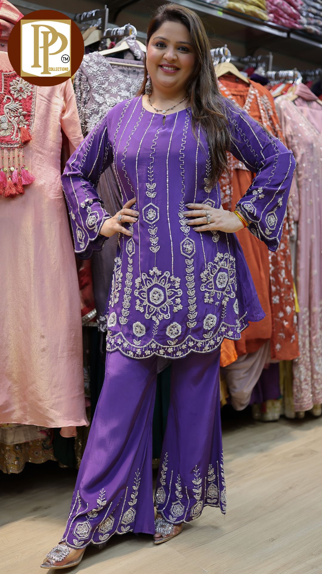 Description : 2pcs cord set Fabric Type : crepe Style : kurta with divider Work Type : full heavy handwork in kurta & sleeves with matching divider . Mk32