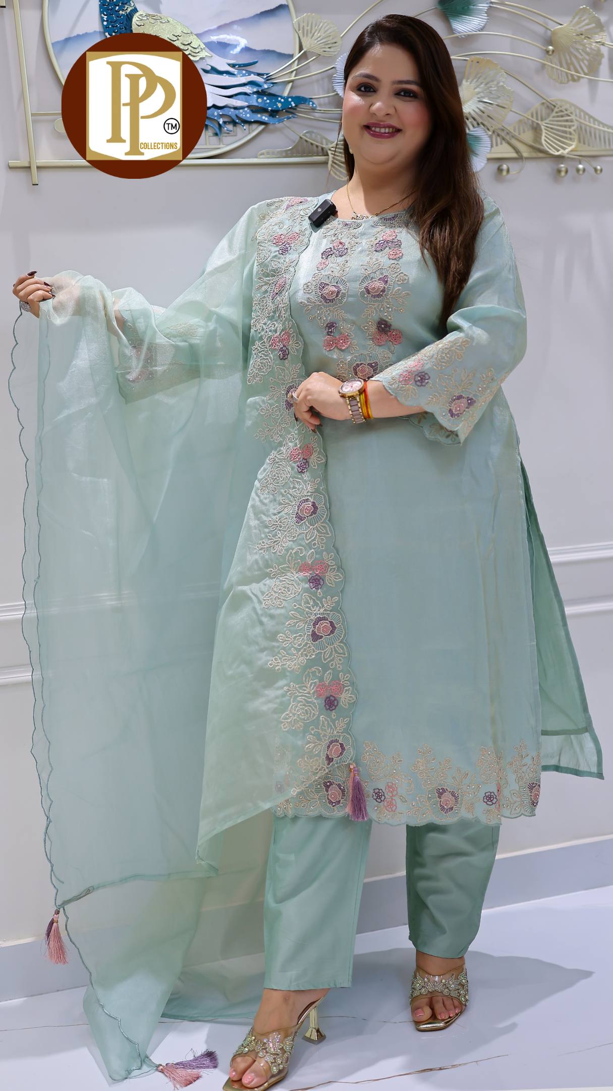 Description : 3pcs Divider set Fabric Type : organza Style : Short Kurta with Divider Work Type : Full heavy Threadwork original mirror work handwork in kurta with Matching Divider & Dupatta. G869