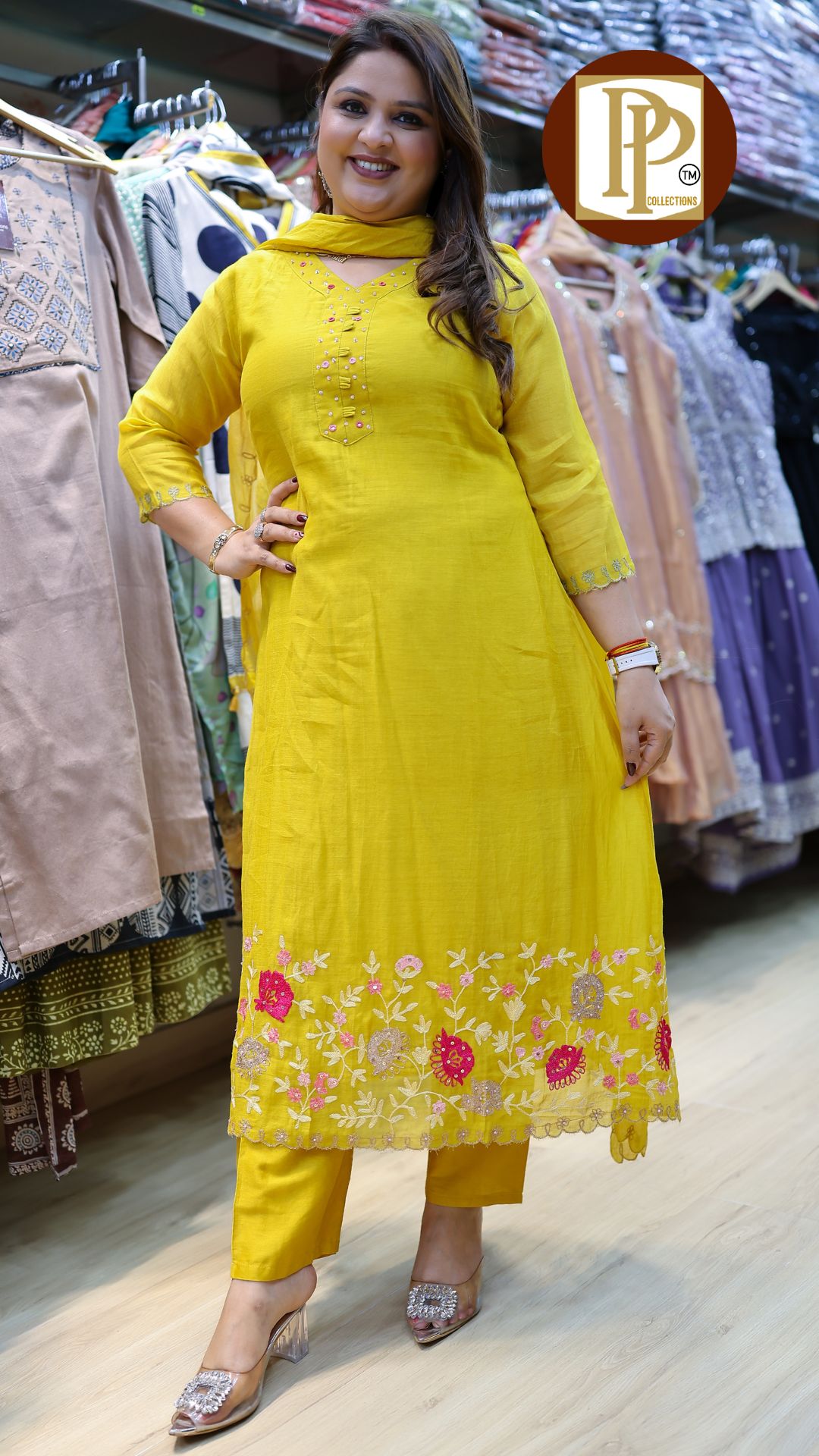 Description : 3pcs Pant set Fabric Type : Mul Chanderi Style : Aline Kurta with Pants Work Type : Full heavy Threadwork Sipi work in kurta with Matching Dupatta & Pants G868