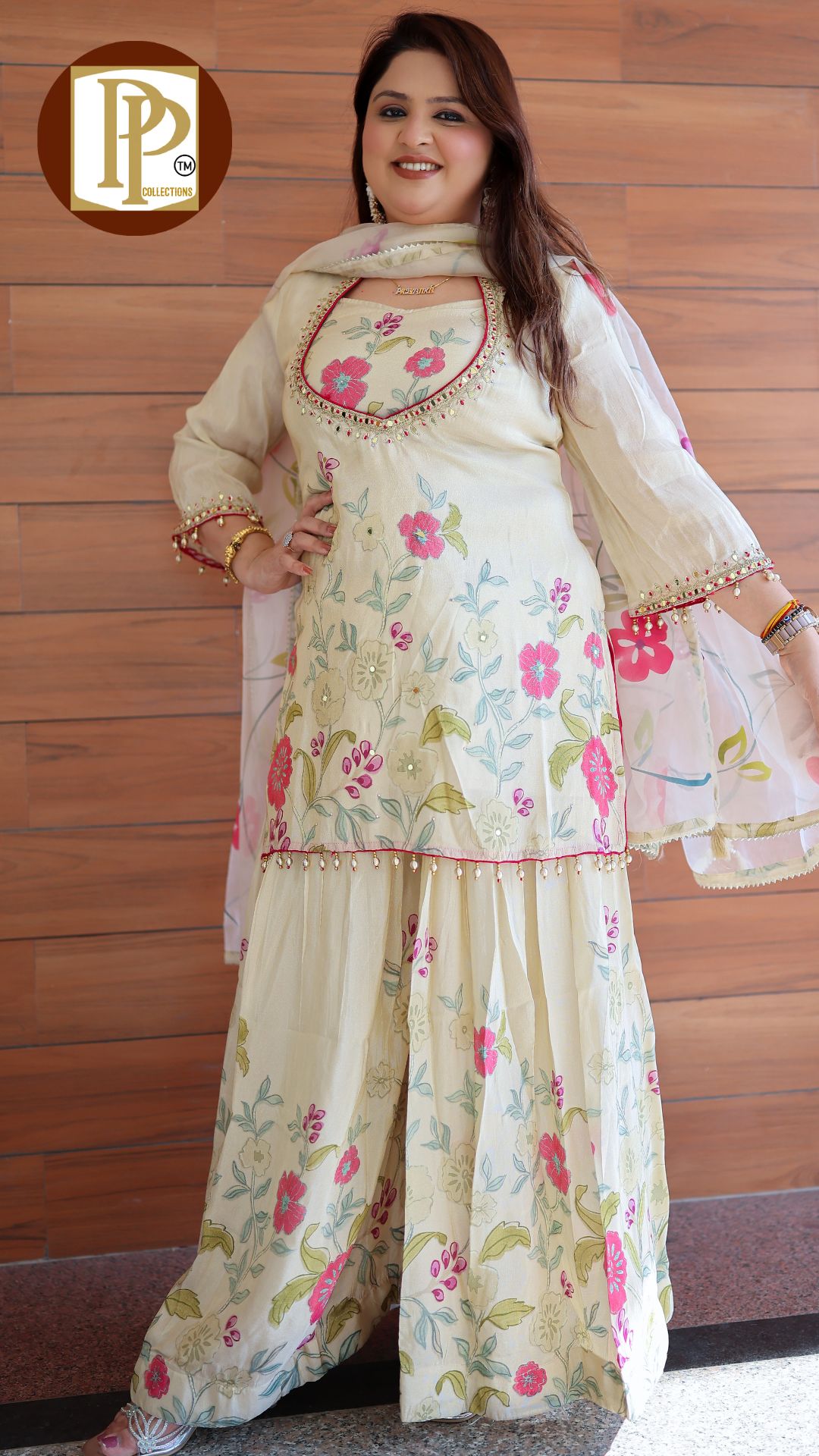 Description : 3pcs pant set Fabric Type : Cotton Style : kurta with pants Work Type : Full handwork threadwork stone Sipi work Jari work original mirror work in kurta with pants . Sy17 Sy18 sy19