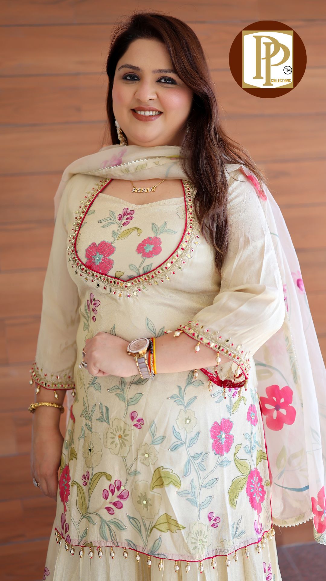 Description : 3pcs divider set Fabric Type : Cotton Style : Aline kurta with divider Work Type : Full threadwork Sipi work in kurta with matching divider & dupatta. SZ26 SZ25 Sz27