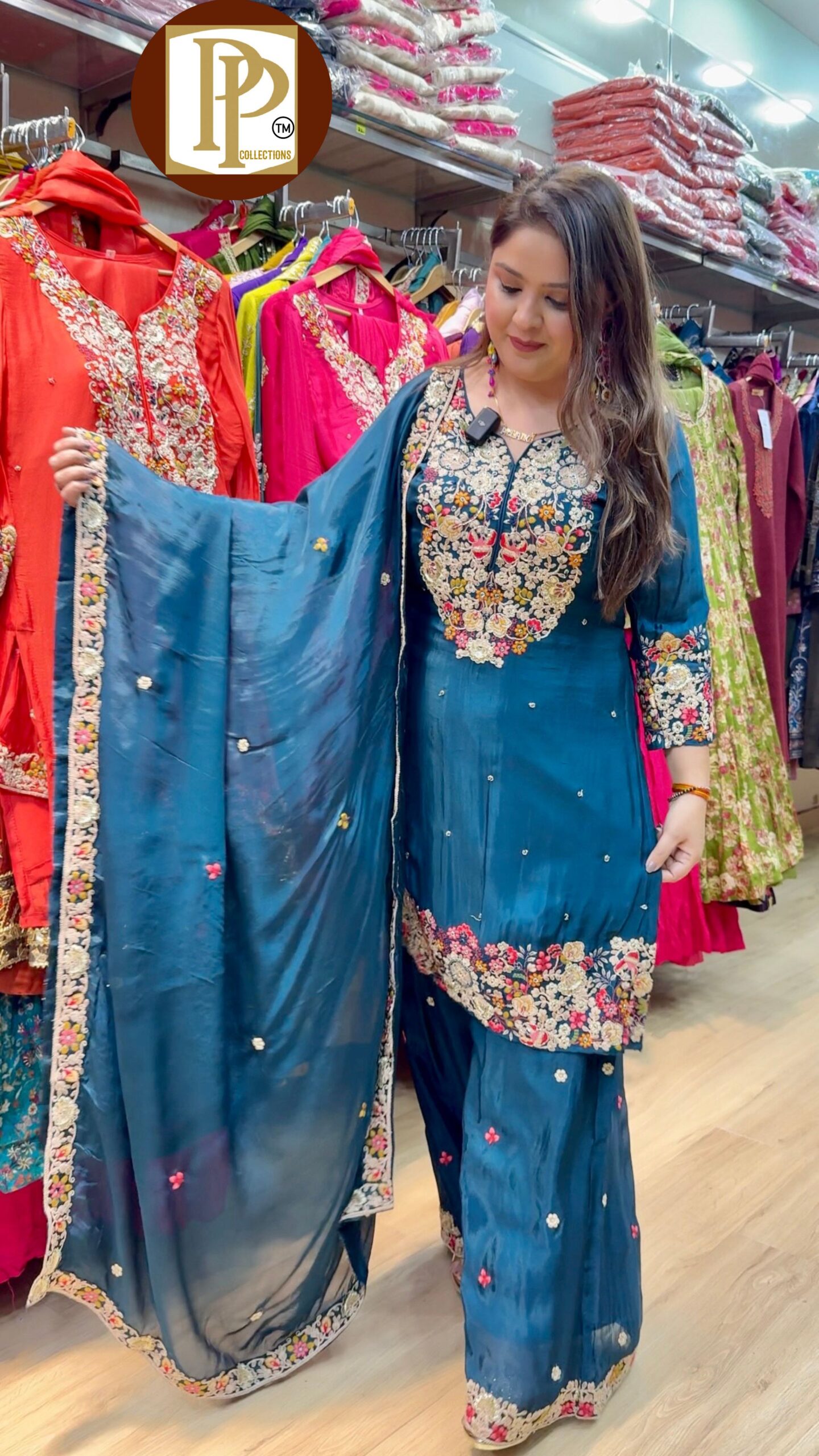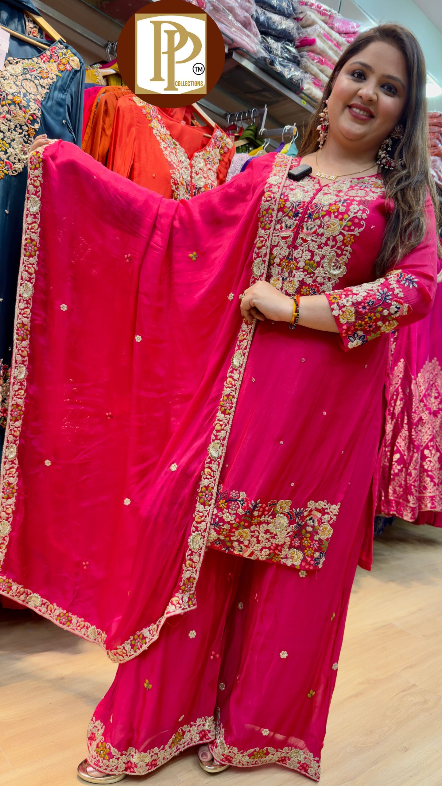 Description : 3 pcs Plazzo Set Fabric Type : Chinnon Style : Short Kurti & Plazzo Set Work Type : Thread & Hand Work With Matching Dupatta.