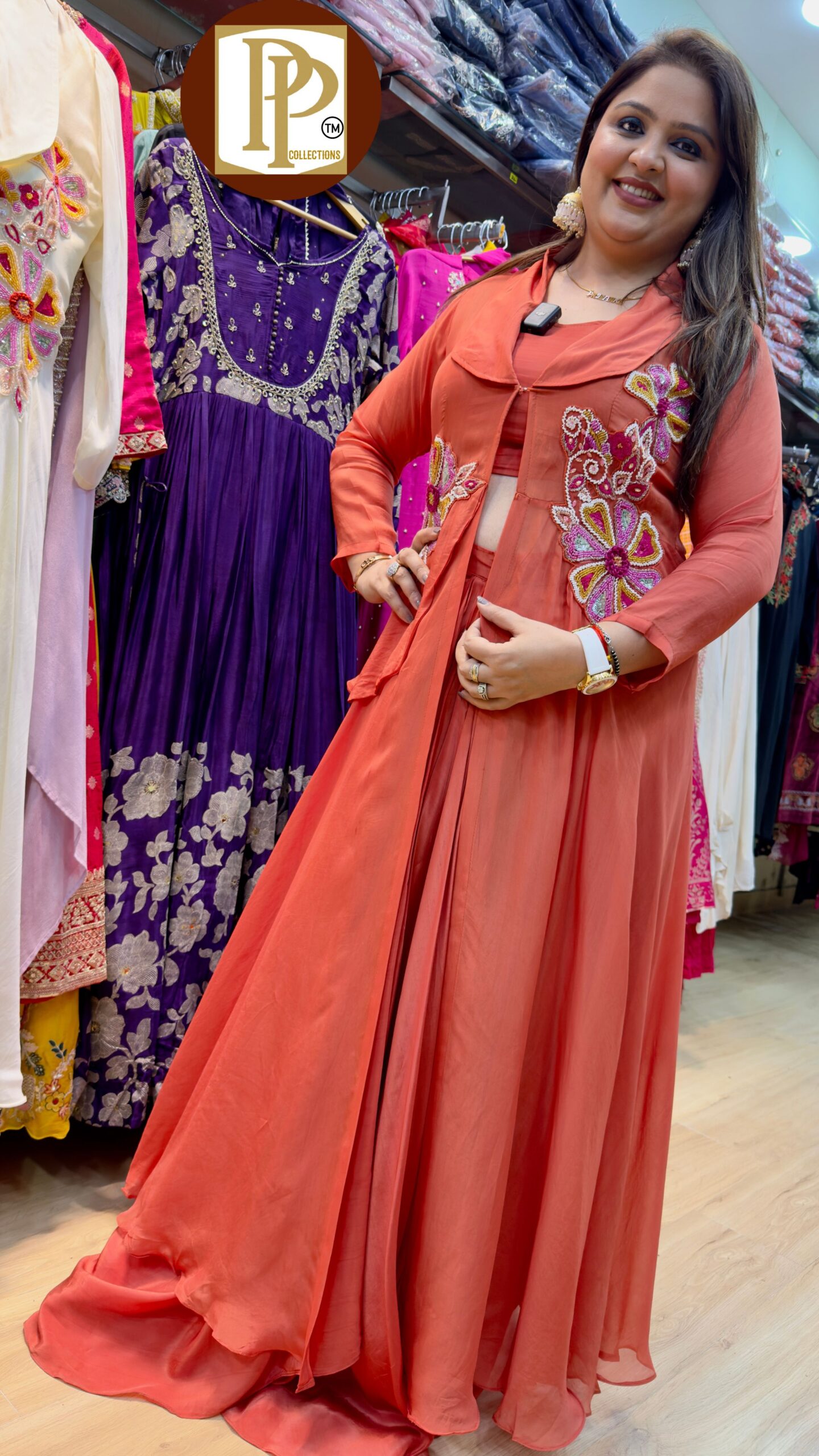 Description : 3 pcs Skirt Set Fabric Type : Crepe Style : Crop Top & Skirt Set Work Type : Hand Detachable Jacket.