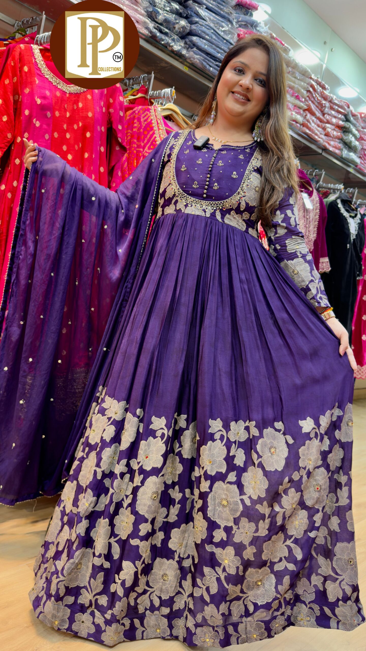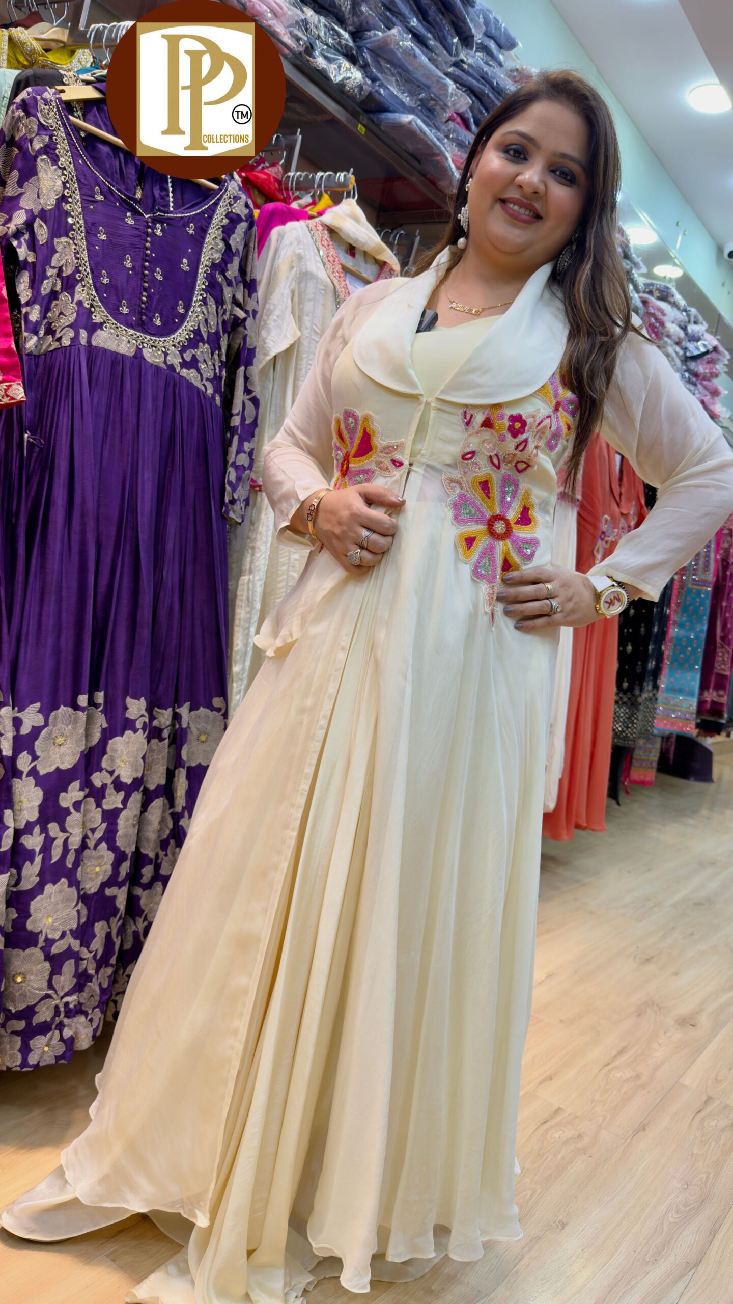 Description : 2 pcs Gown Fabric Type : Chinnon Style : Gown Work Type : Heavy Hand Work With Matching Dupatta.