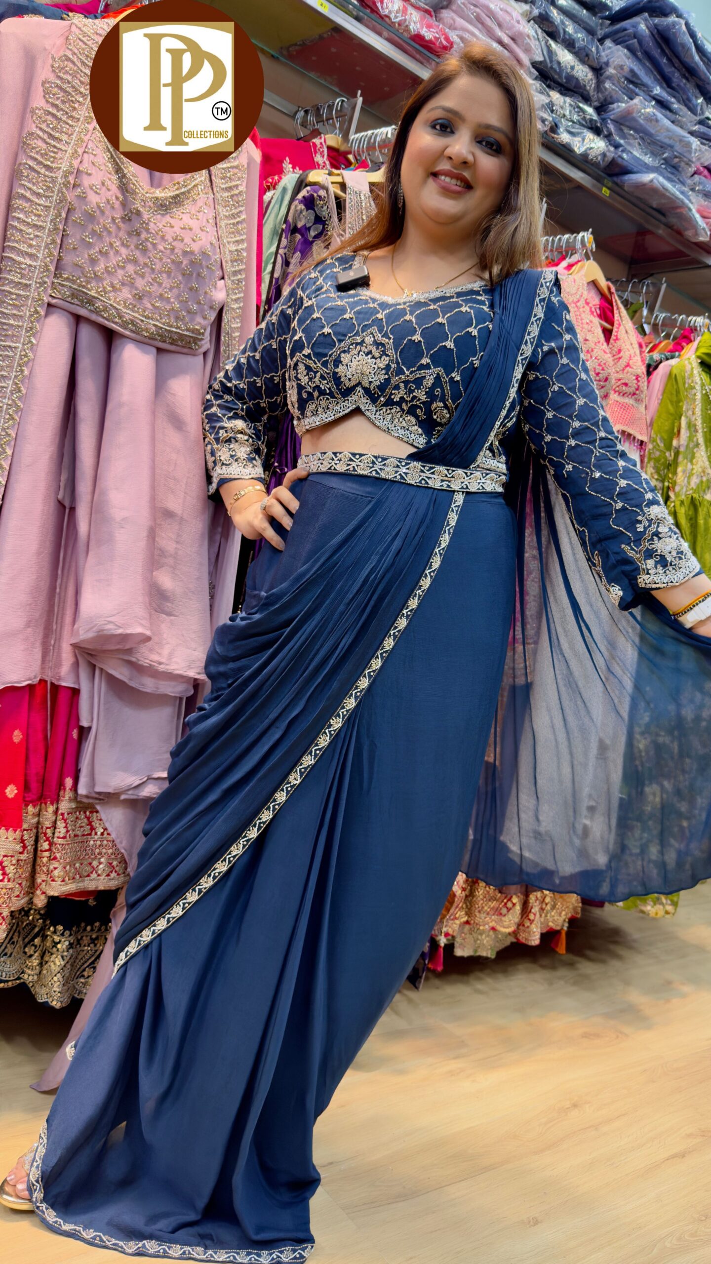 Description : 3 pcs Skirt Set Fabric Type : Chinnon Style : Raday To Wear Sari Set Work Type : Havey Hand Work On Blouse With Matching Balt.