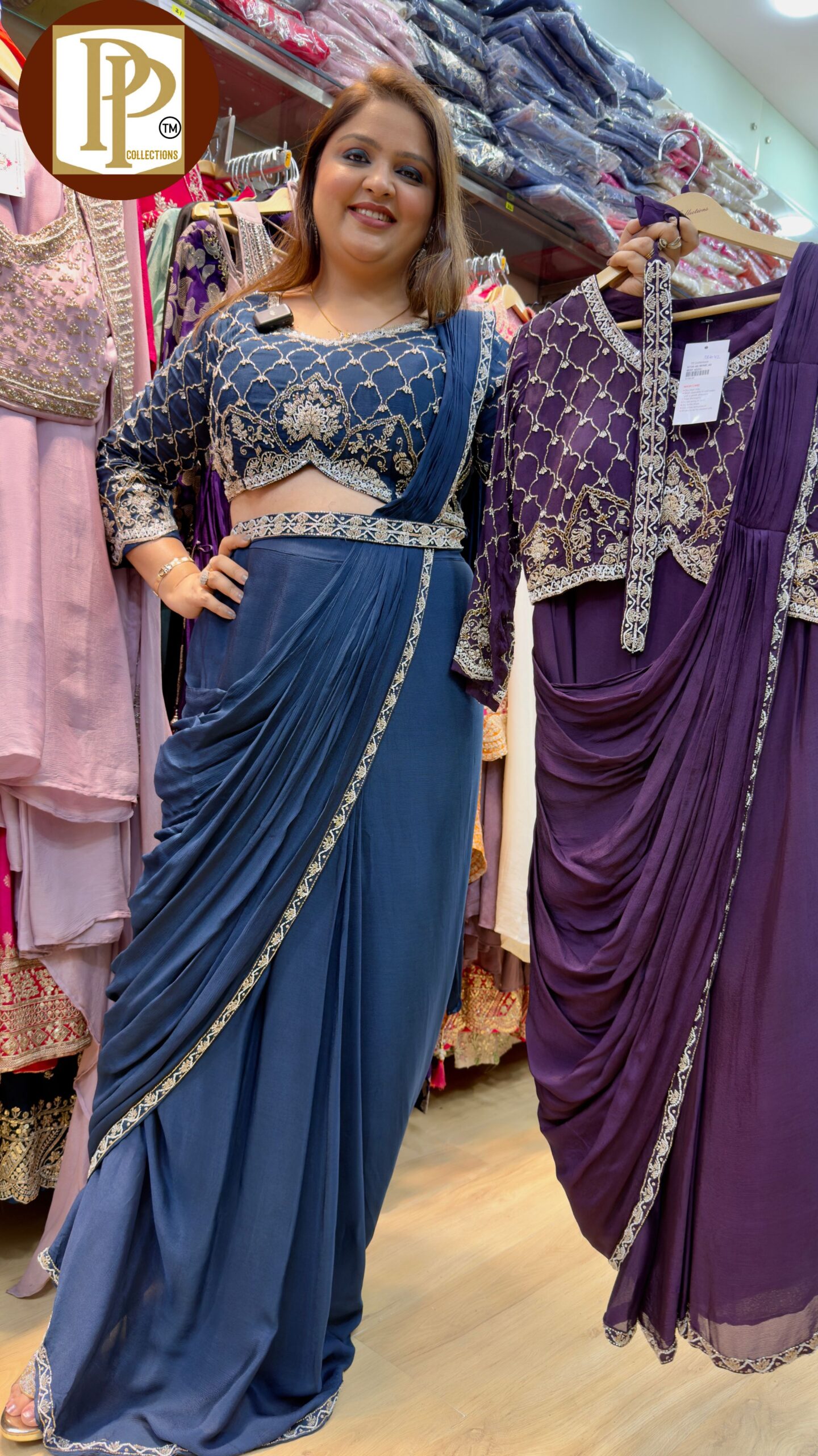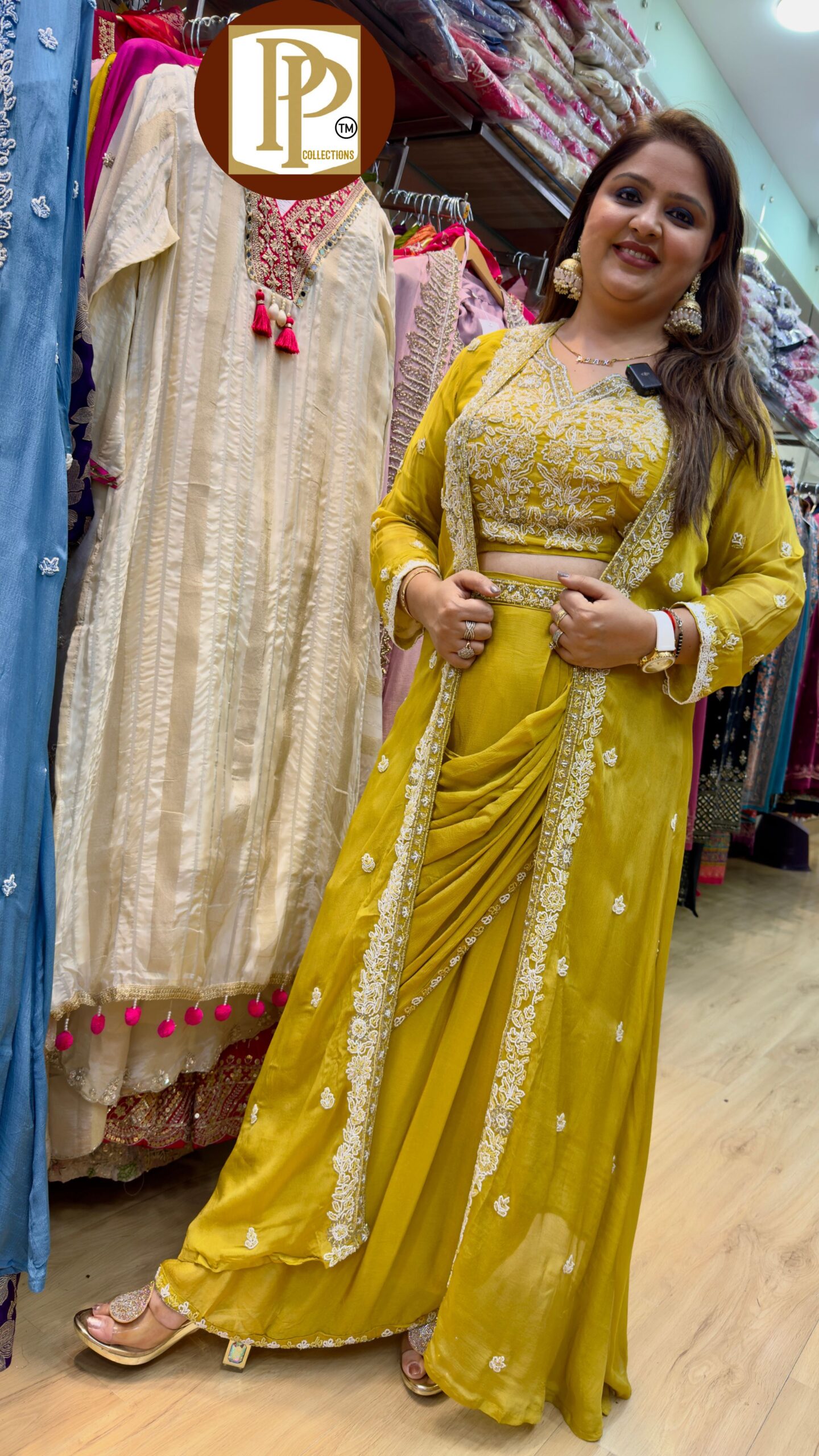 Description : 3piece Skirt Set Fabric Type : Chinnon Style : Crop Top & Skirt Set Drap Sari Work Type : Full Have Hand Work Balt With Matching Detachable Shrug.
