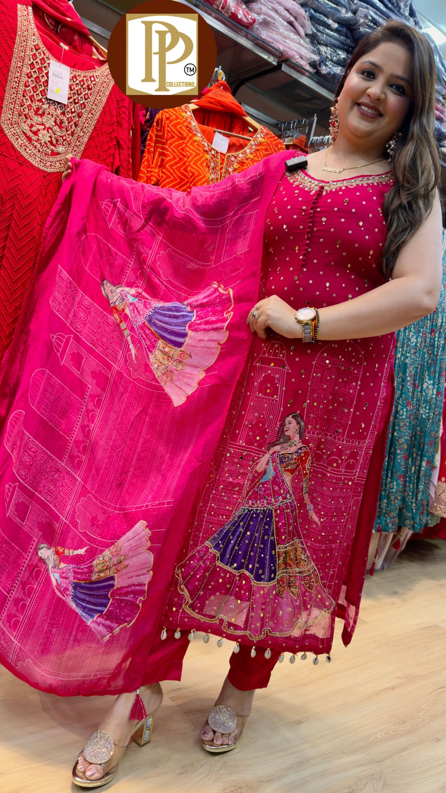 Description : 3piece Pant Set Fabric Type : Banarasi Silk Style : Straight Set Work Type : Jacquart Print On Hand Work With Matching Dupatta.