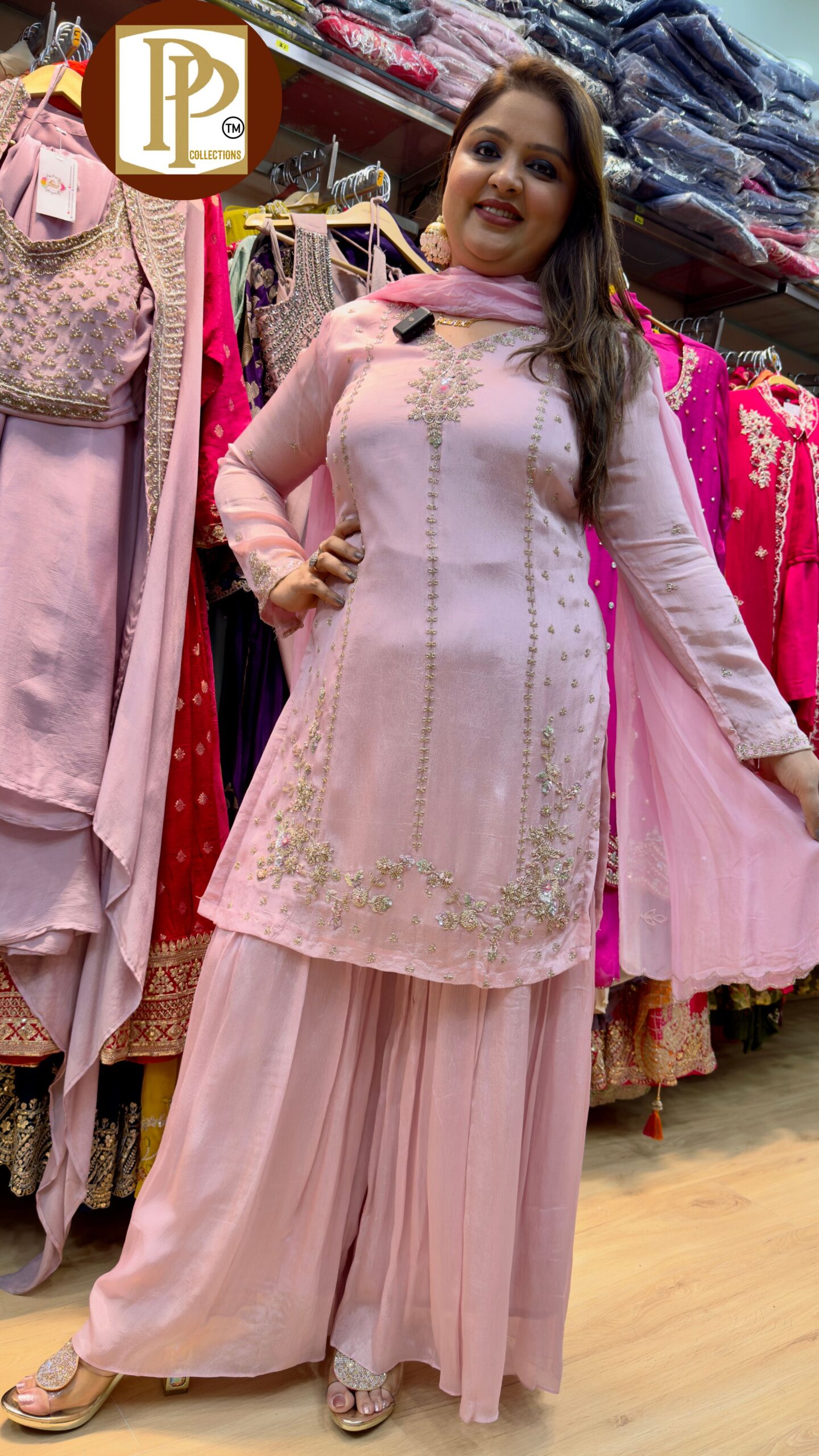 Description : 3 pcs Sharara Set Fabric Type : Chinnon Style : Short Kurti & Sharara Set Work Type : Heavy Hand Work With Matching Organza Dupatta.