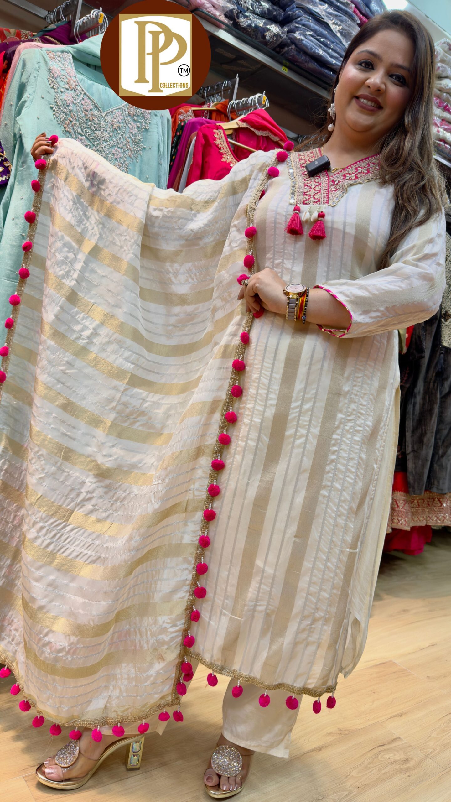 Description :3pcs Pant Set Fabric Type : Organza Style : Stripe Pattern Straight Set Work Type : Hand & Original Mirror Work With Matching Dupatta.