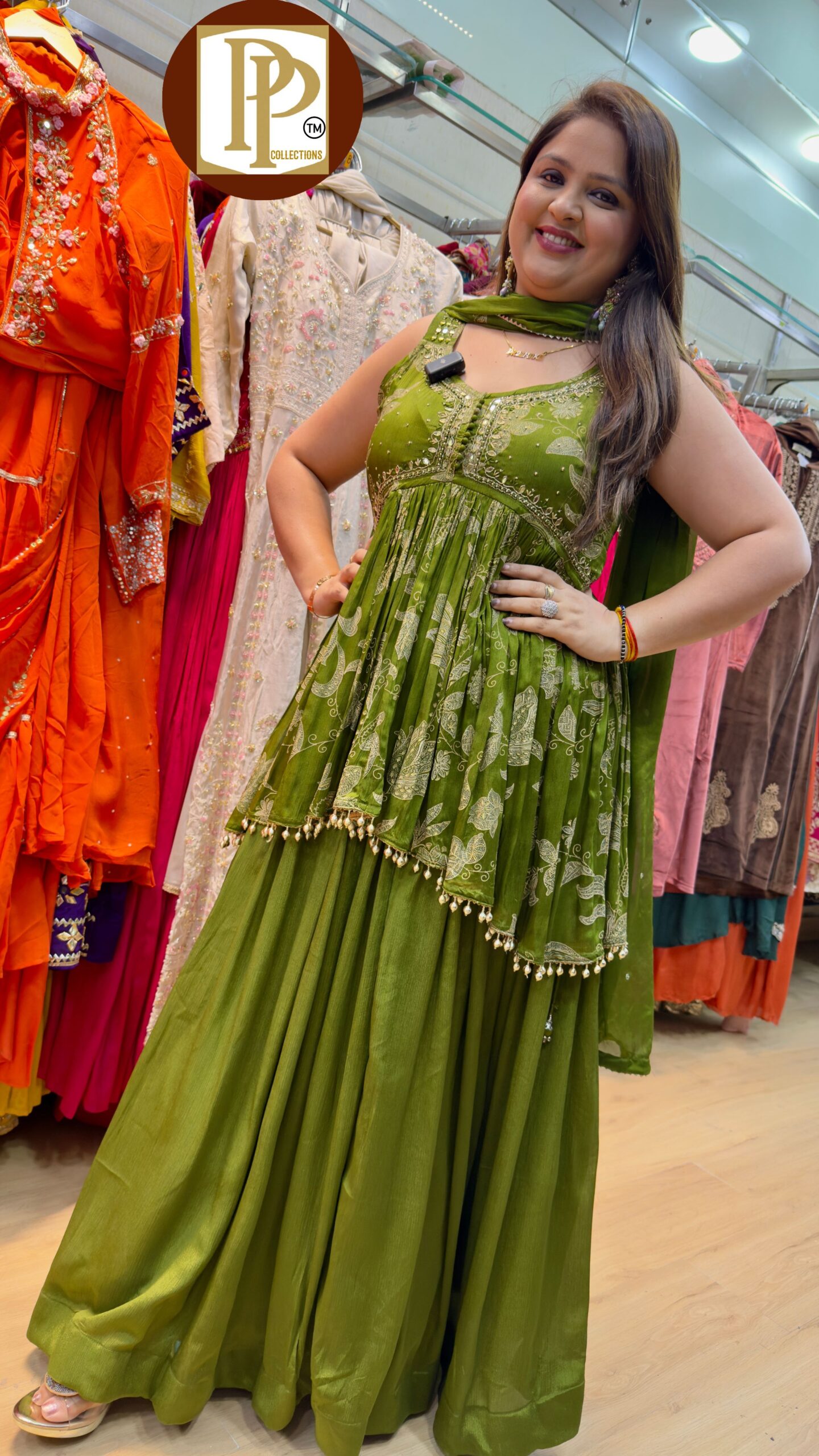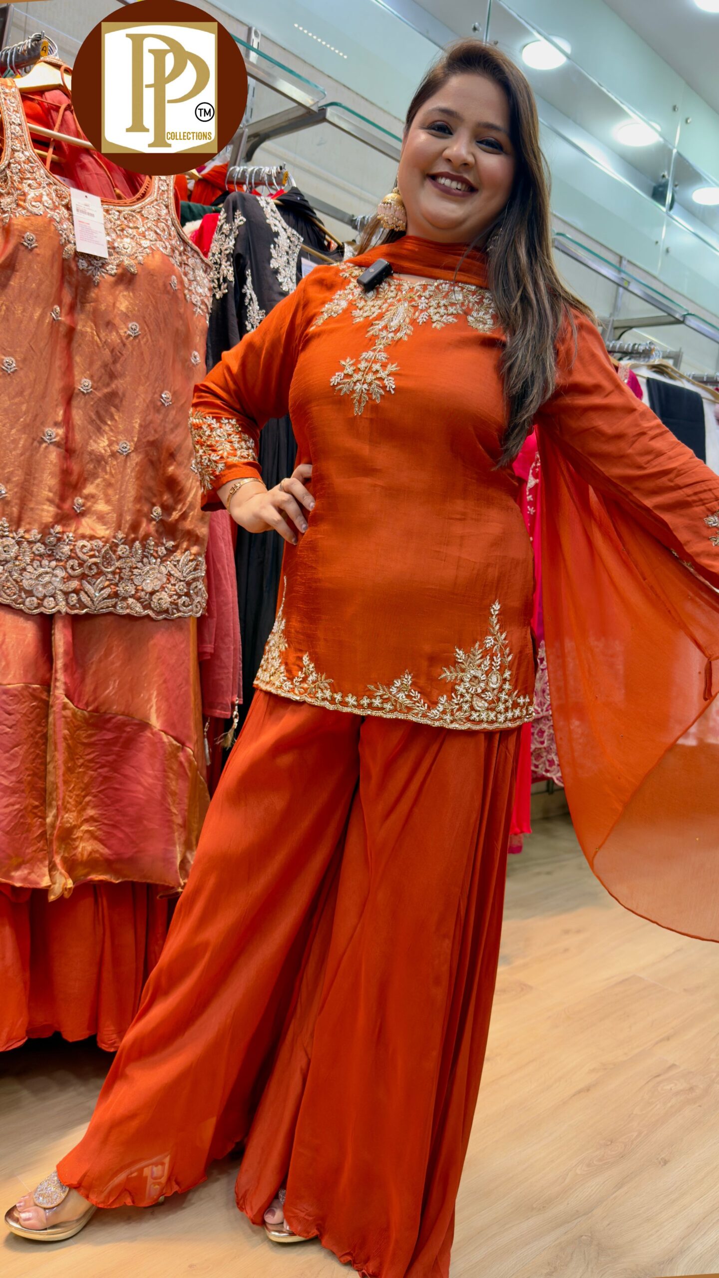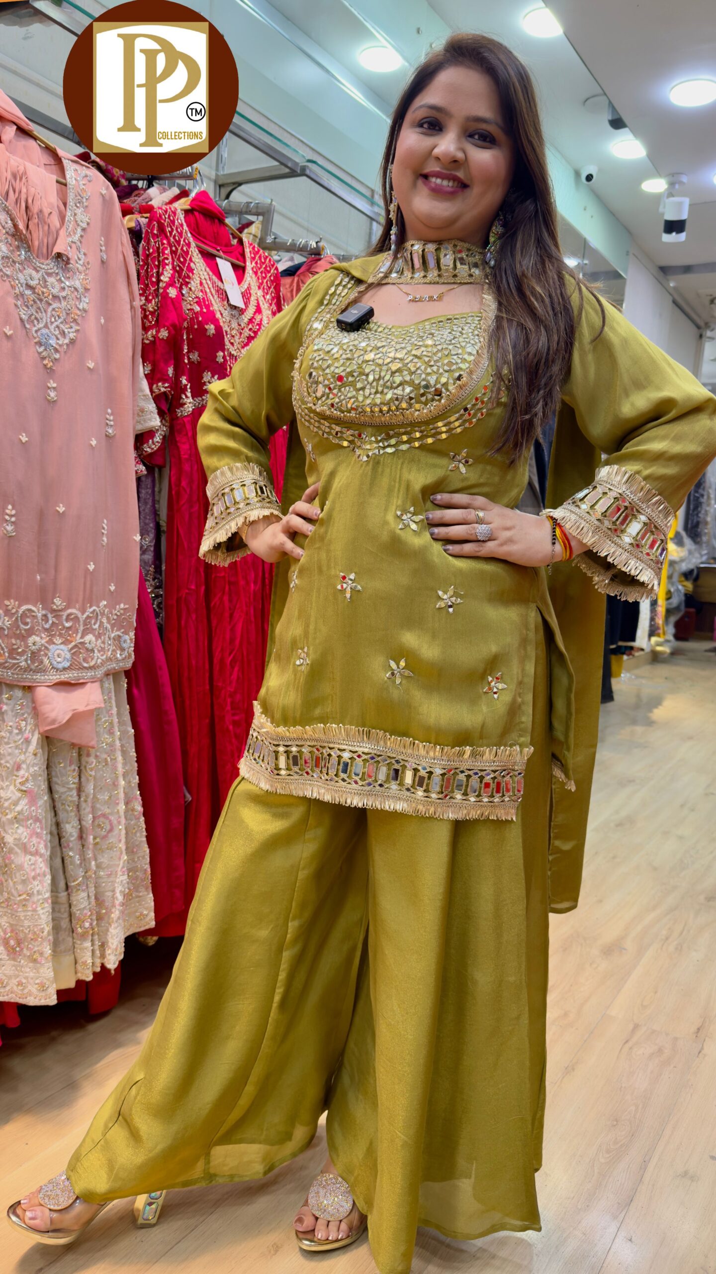 Description : 3 pcs Plazzo Set Fabric Type : Tissue Style : Bust Year Spaghetti & Plazzo Set Work Type : Thread & Original Mirror Work Detachable Jacket With Matching Choker Style Dupatta.