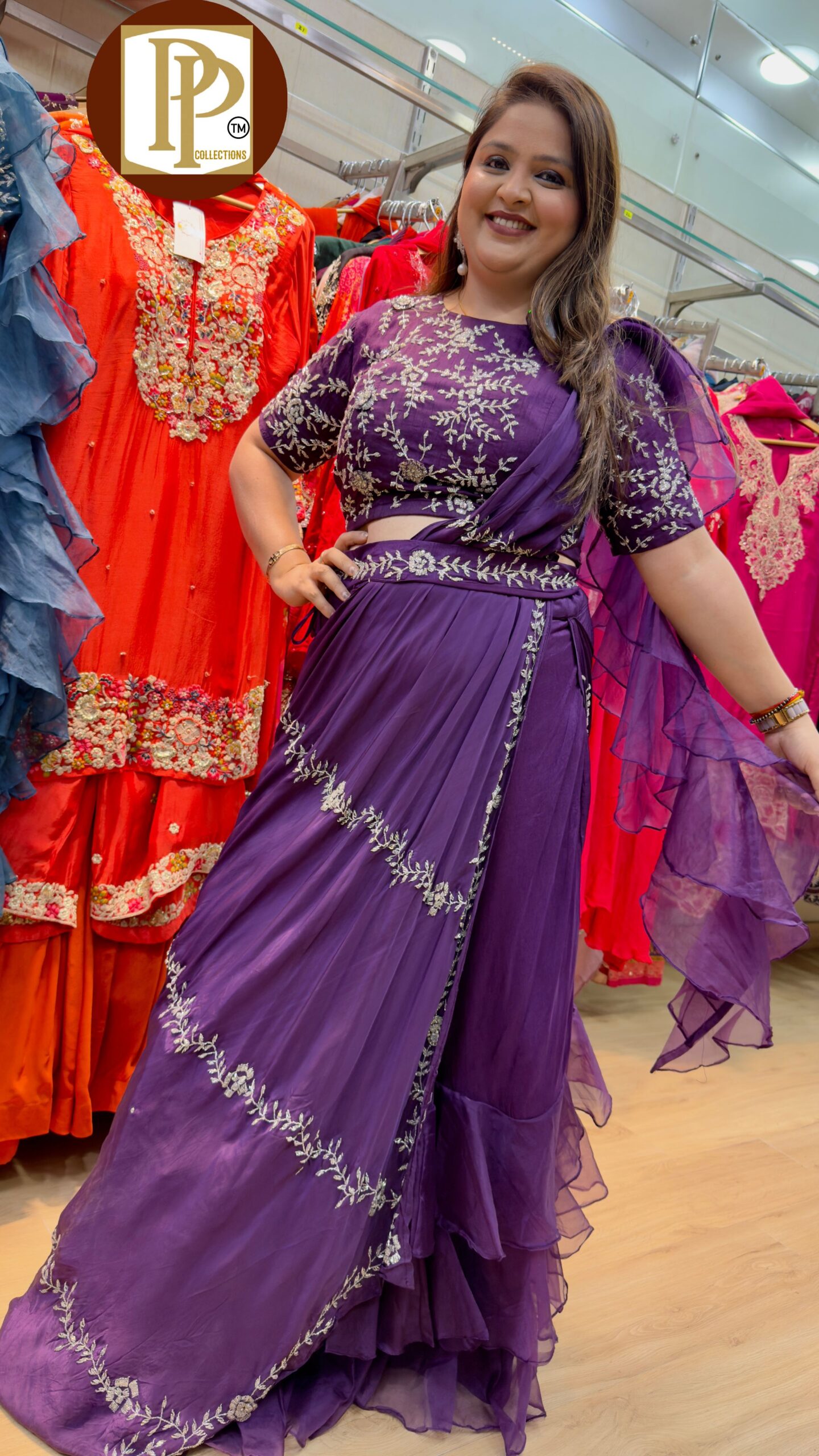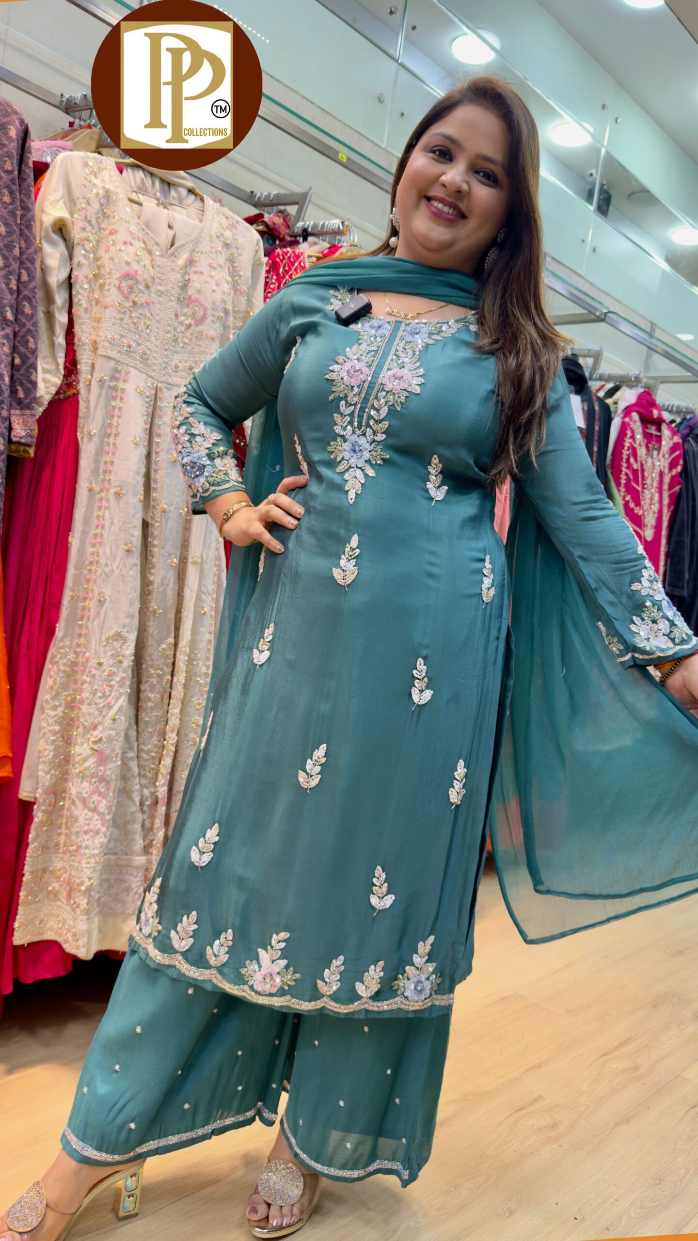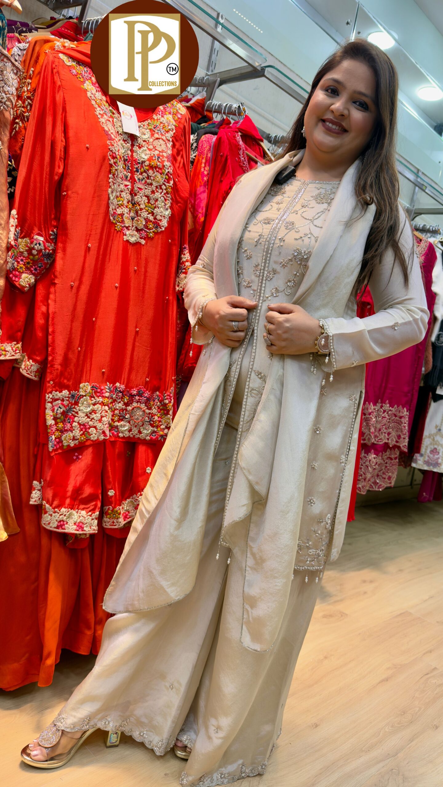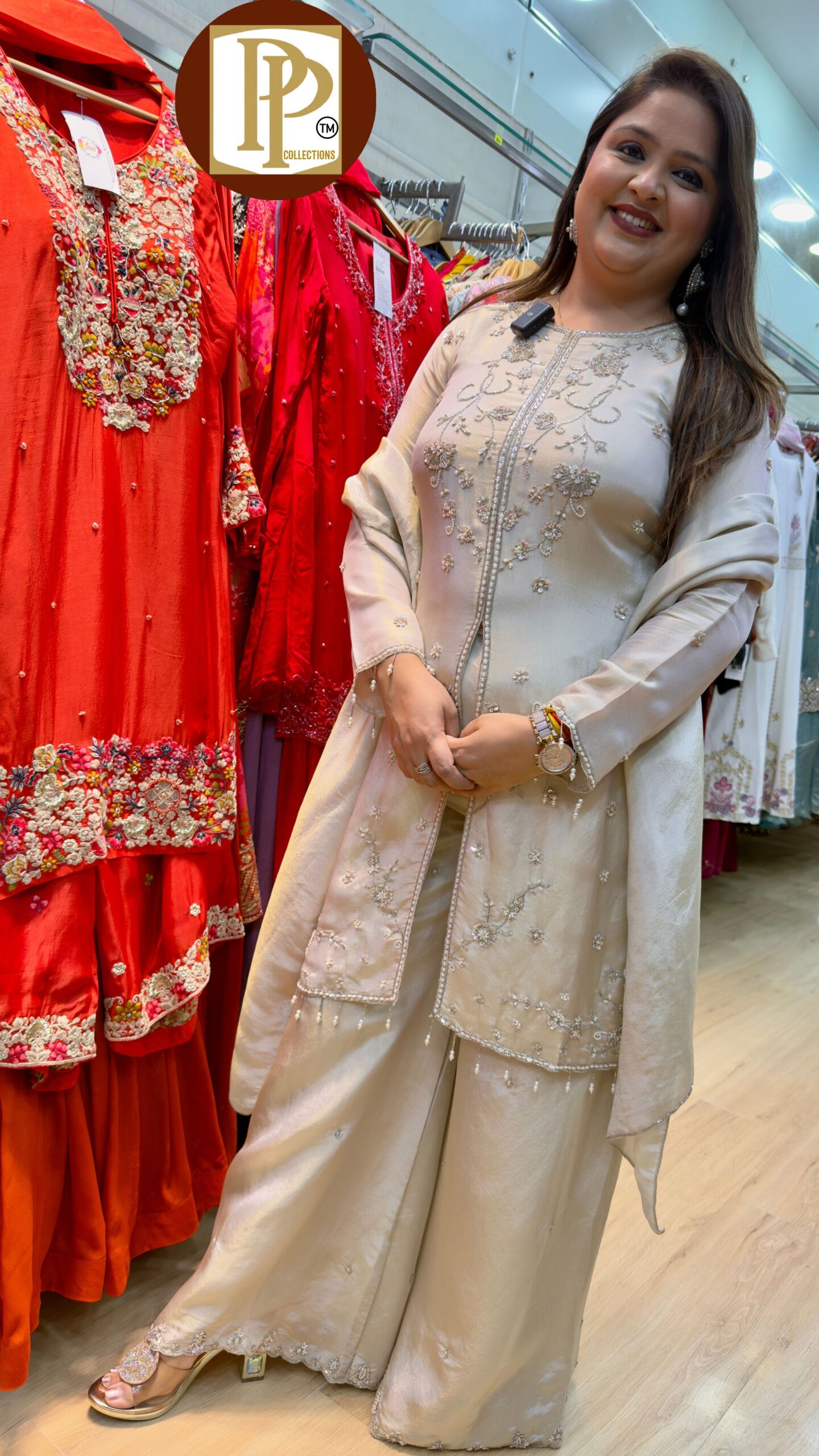 Description : 3 pcs Plazzo Set Fabric Type : Tissue Style : Bust Year Spaghetti & Plazzo Set Work Type : Thread & Original Mirror Work Detachable Jacket With Matching Choker Style Dupatta.