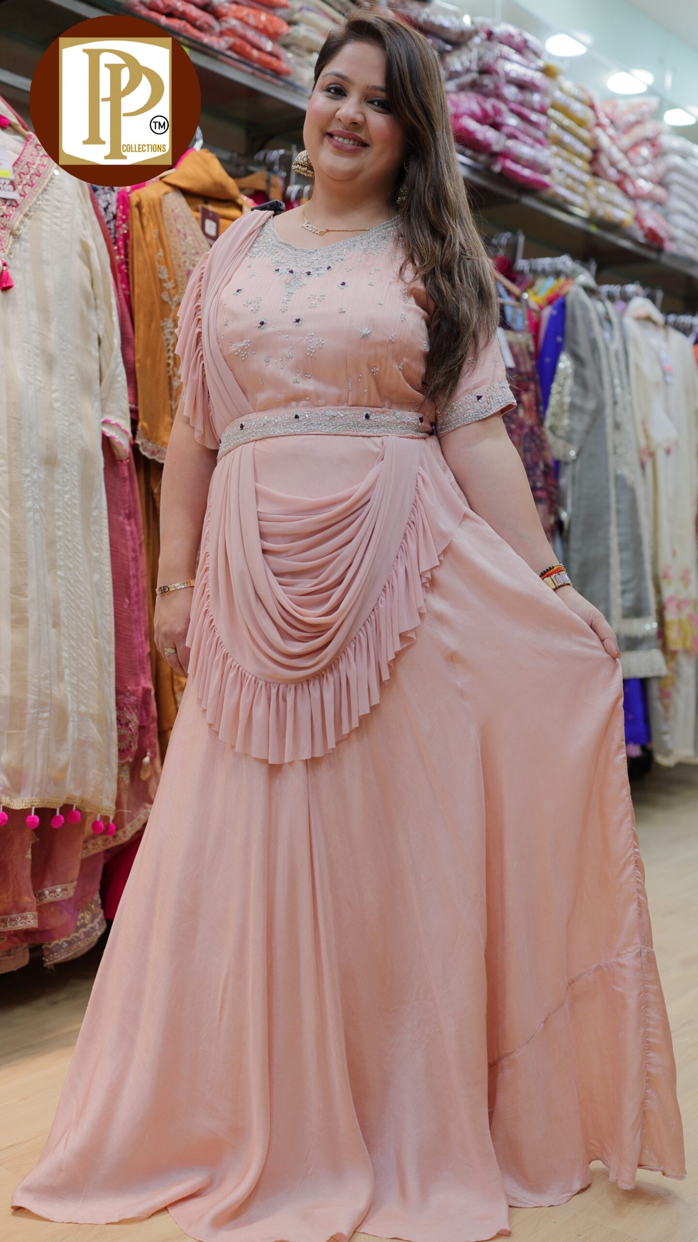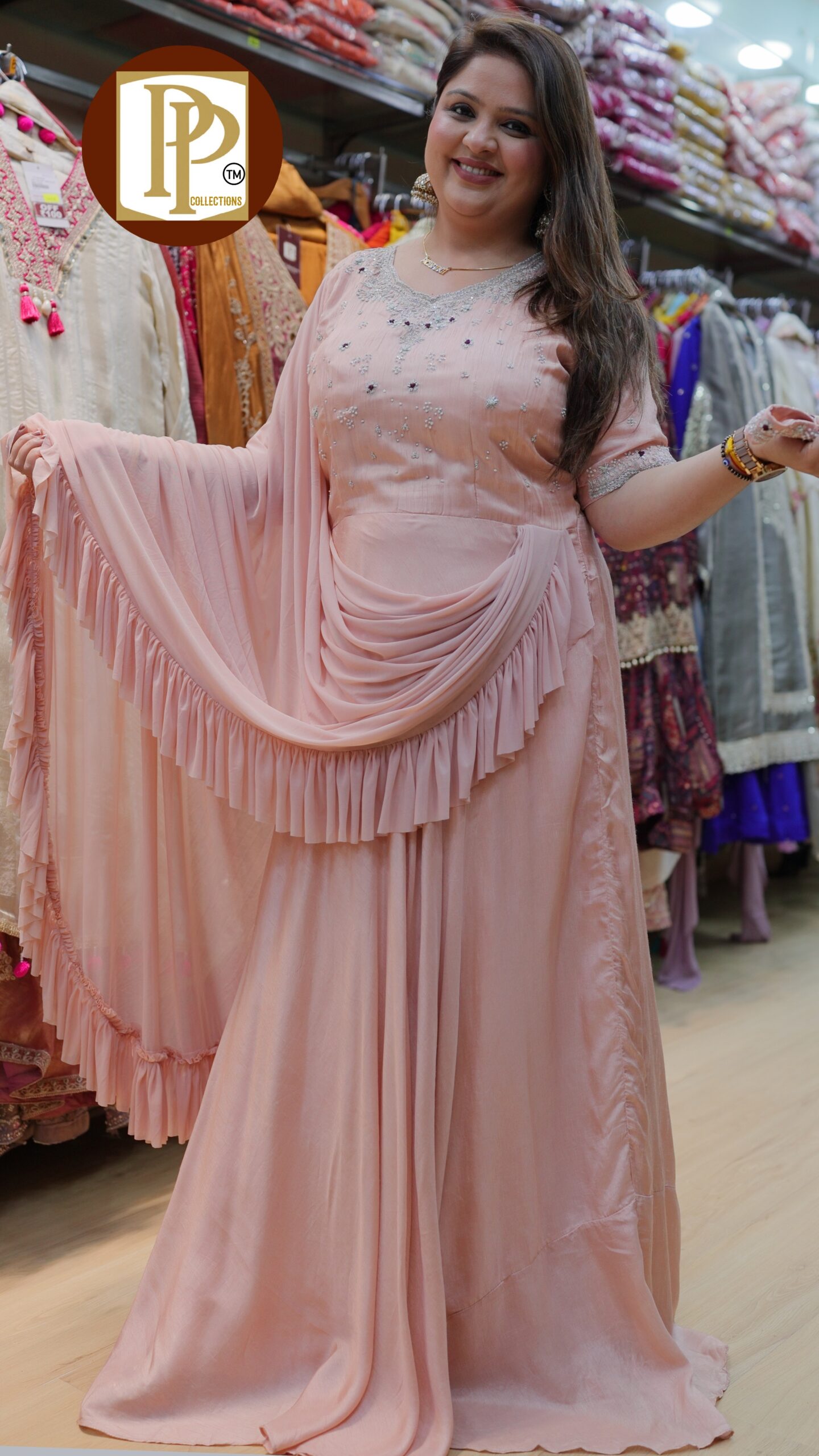 Description : 3pcs drape set Fabric Type : chinnon Style : croptop with skirt Work Type : heavy handwork in croptop & matching jacket with matching skirt .