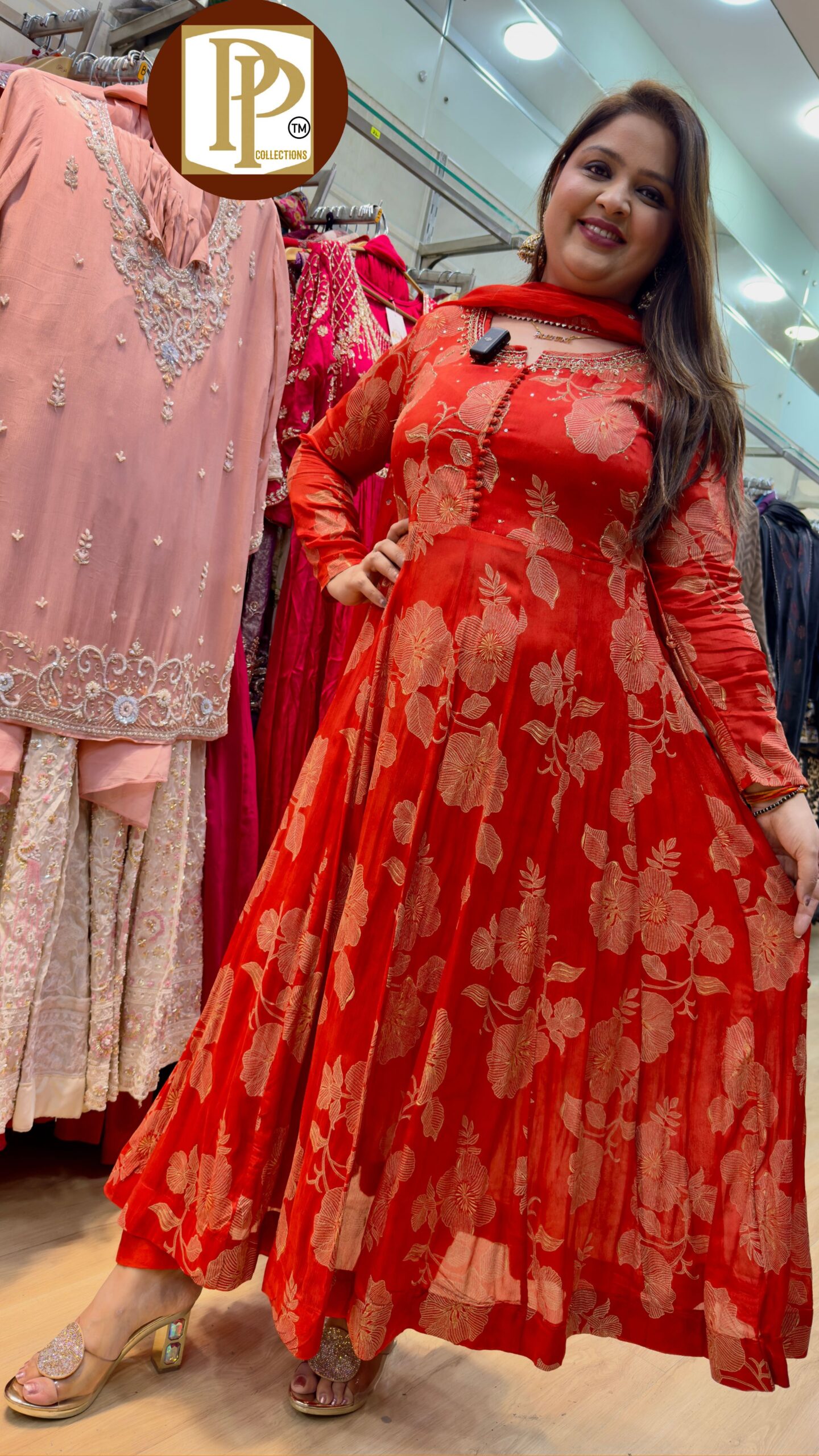 Description : 3pcs divider Set Fabric Type : Chinnon Style : aline Co-ord Sets Bustier Article Work Type : All Over Printed Hand Work Potli With Matching Detachable Jacket & choker neck dupatta .
