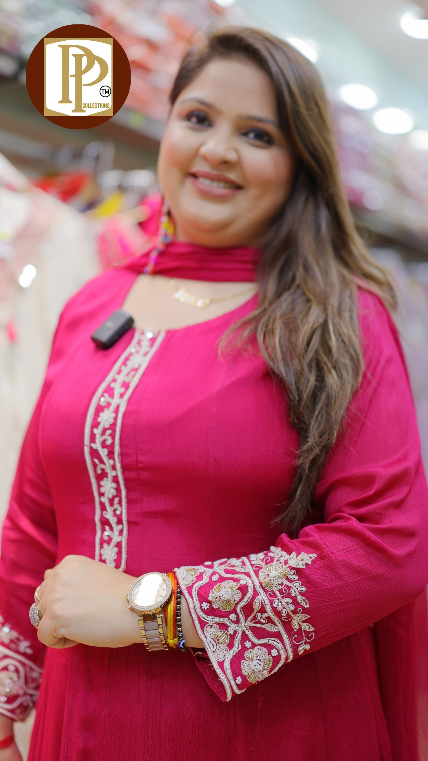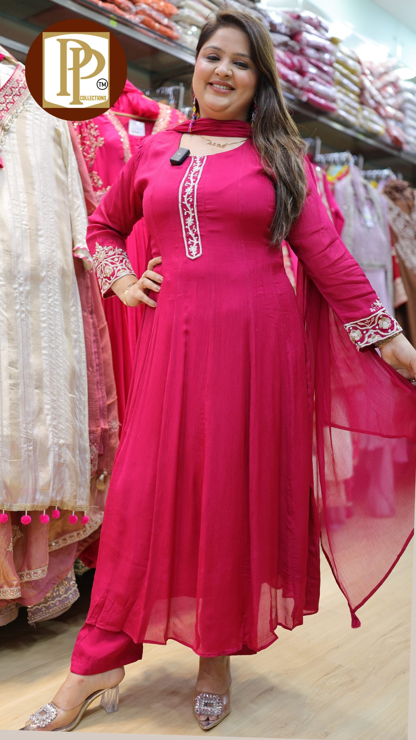 Description : 3pcs anarkali set Fabric Type : chinnon Style : Anarkali with pants Work Type : heavy handwork in anarkali with matching pants & dupatta .