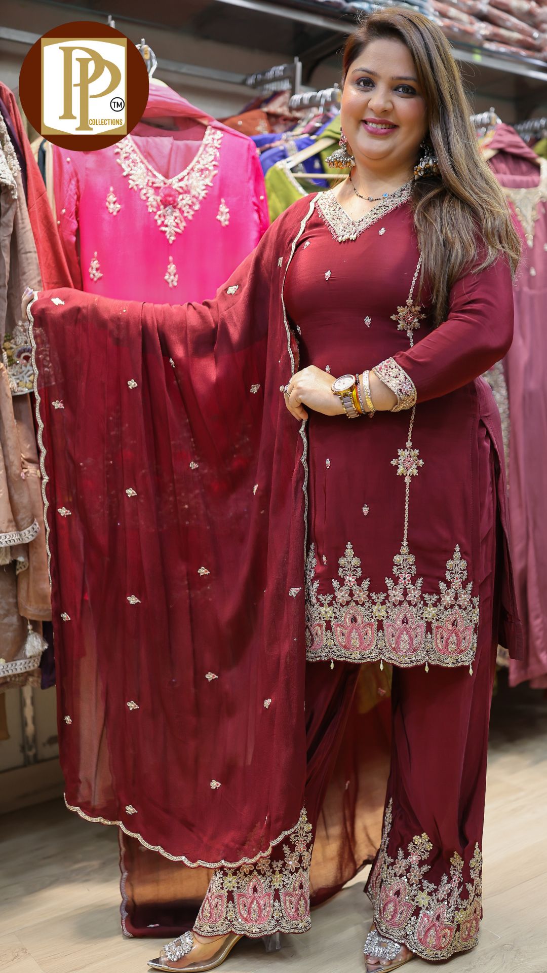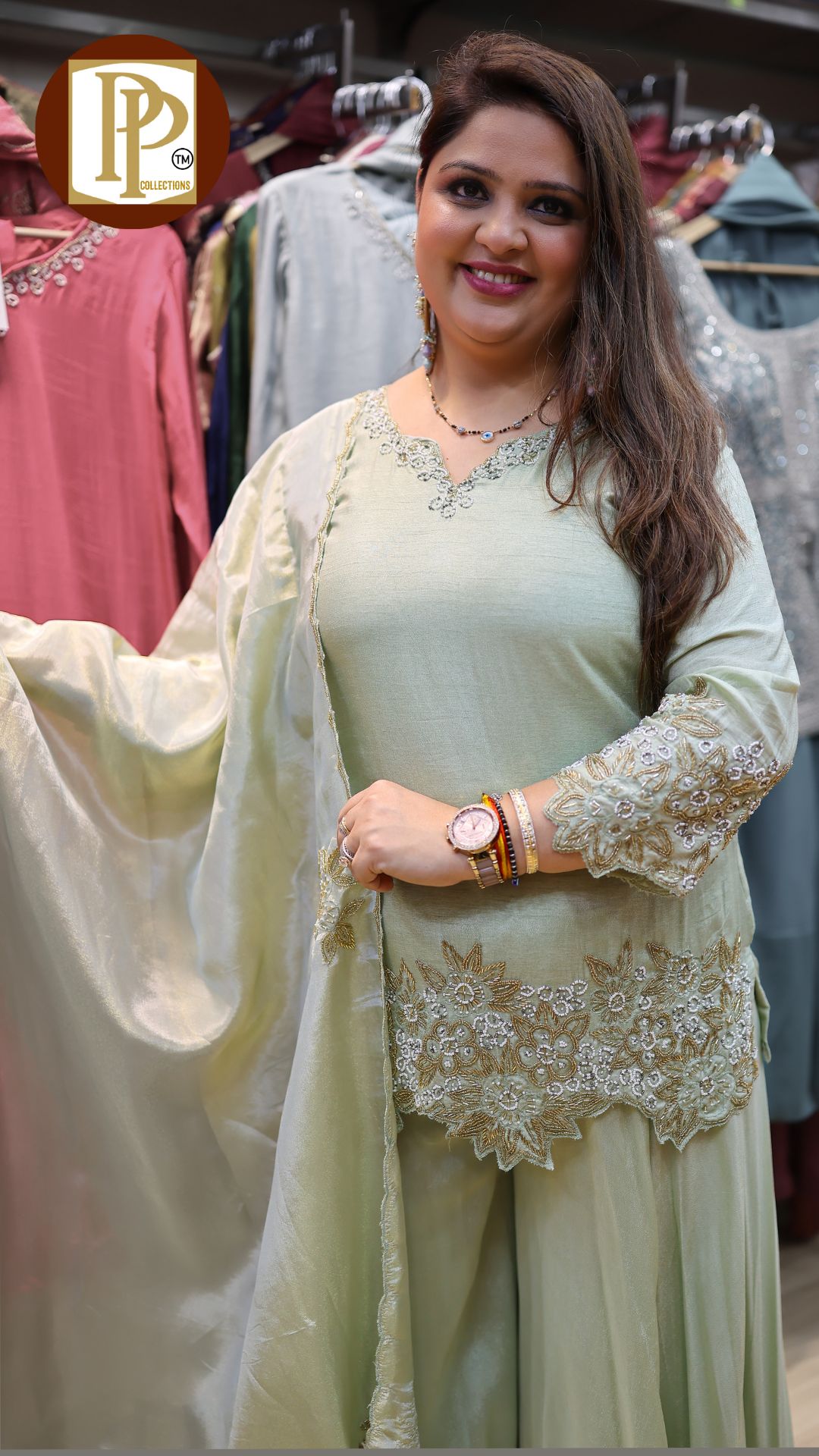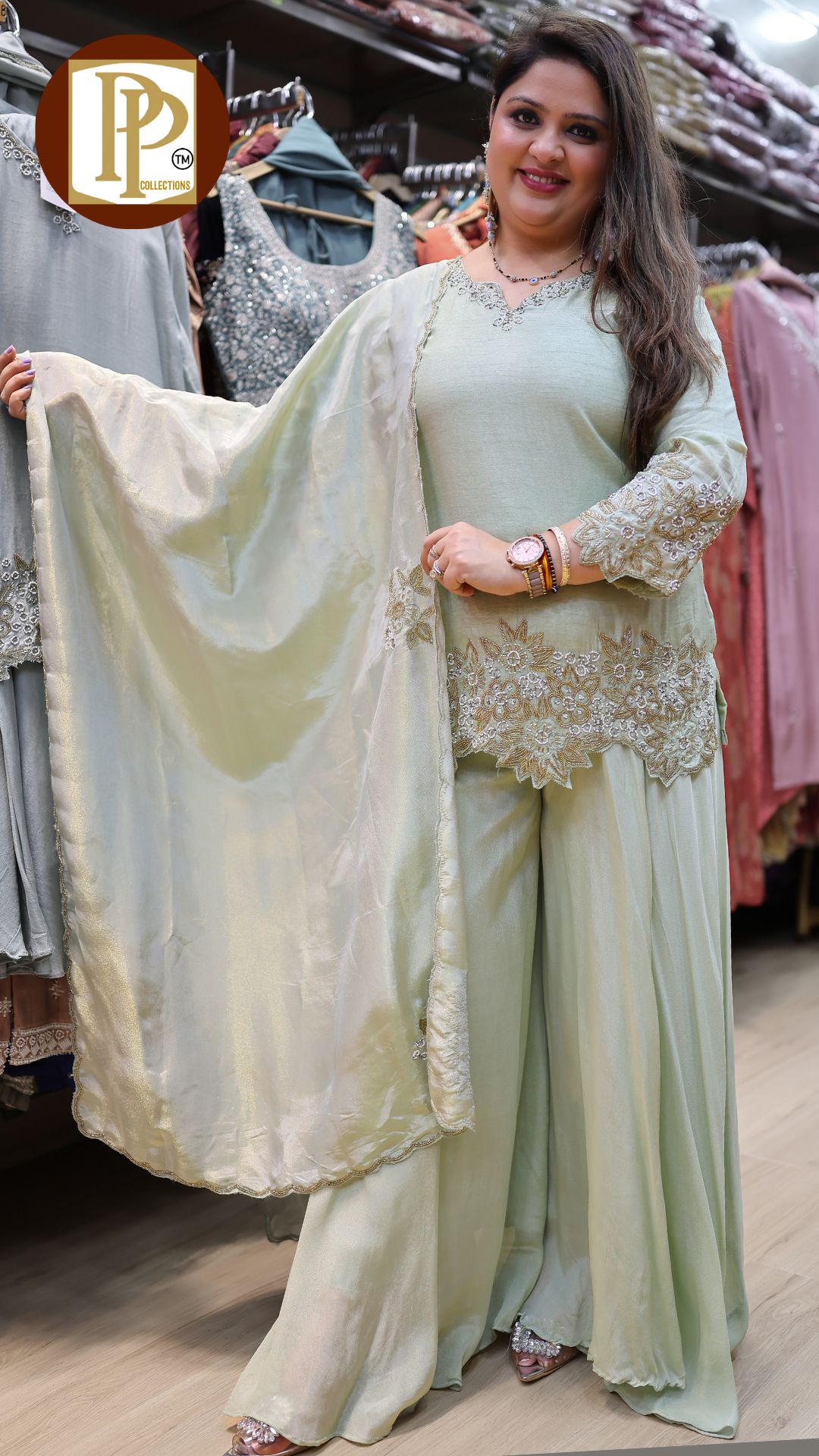 Description : 3pcs divider set Fabric Type : tissue Style : kurta with divider Work Type : all over full heavy handwork in kurta with matching also handworked dupatta & heavy divider