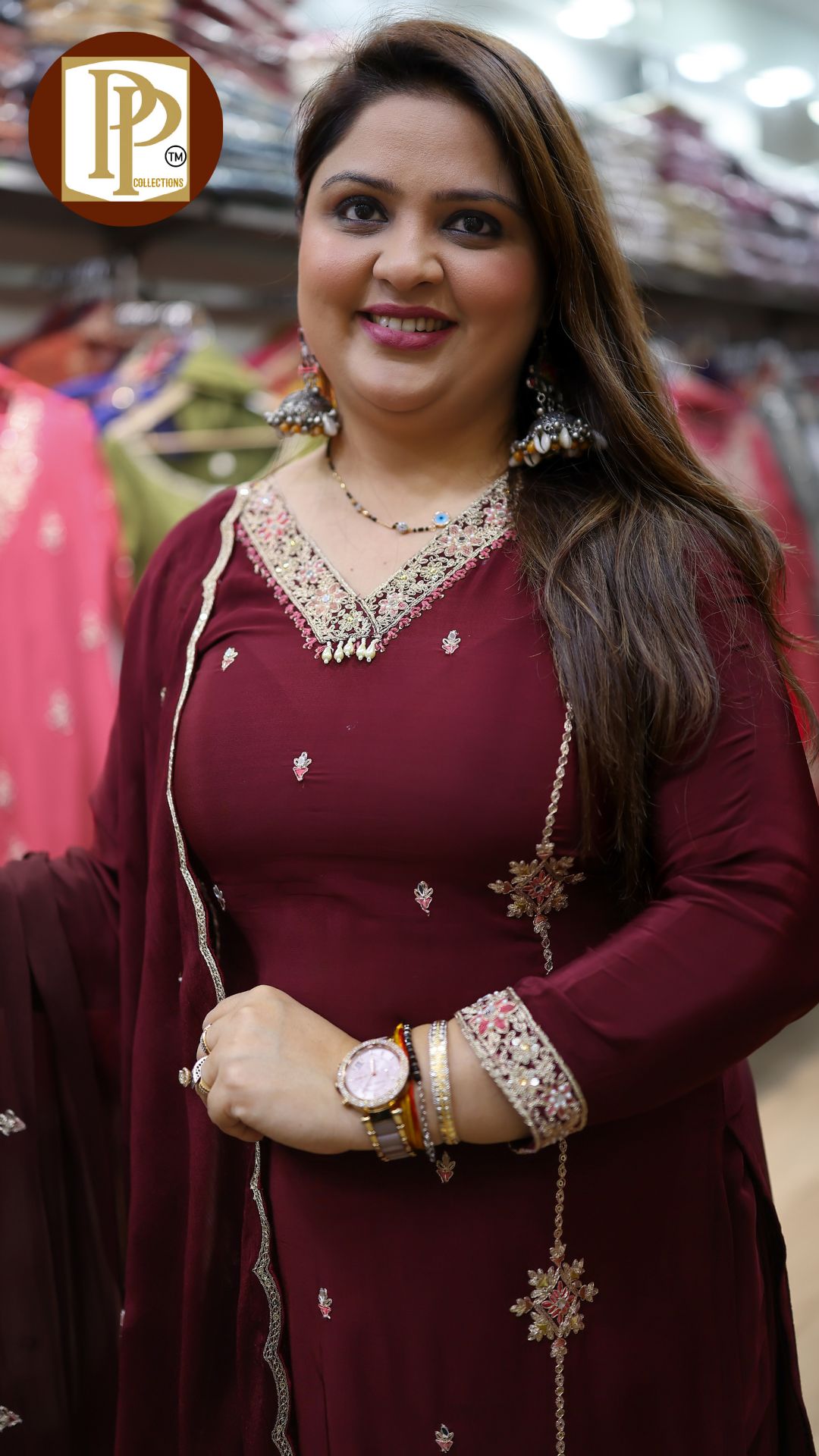 Description : 3pcs divider set Fabric Type : crepe Style : short kurta with divider Work Type : heavy handwork & threadwork in short kurta with matching dupatta & pants .