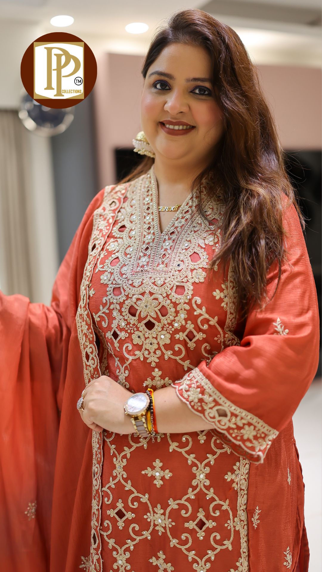Description : 3pcs divider set Fabric Type :Chinnon Style : kurta with divider Work Type : Full heavy handwork stone work in kurta with matching pants & dupatta . S964