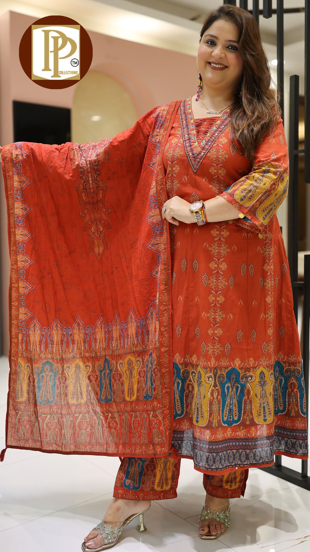 Description : 3pcs pent set Fabric Type : Cotton Style : Aline Anarkali with pants Work Type : all over printed work in Anarkali threadwork also with matching pants & dupatta . L108