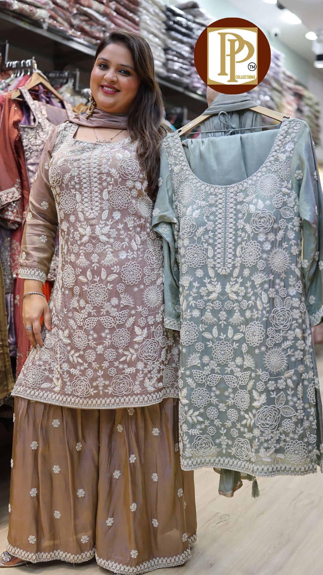 Description : 3pccs palazzo set Fabric Type : Crepe Style : Short kurta with palazzo Work Type : Full Zari work threadwork original mirror work in Kurt a