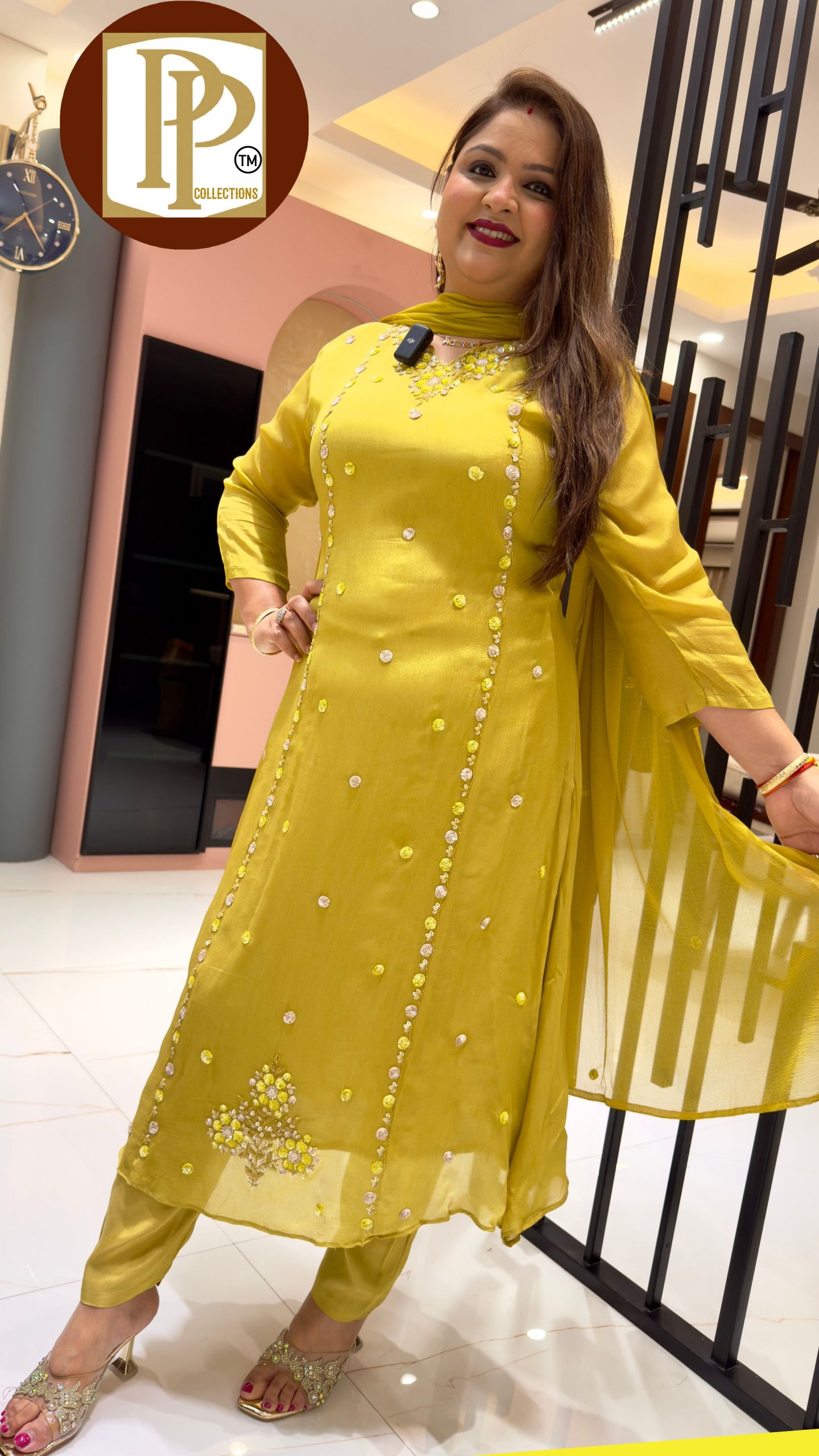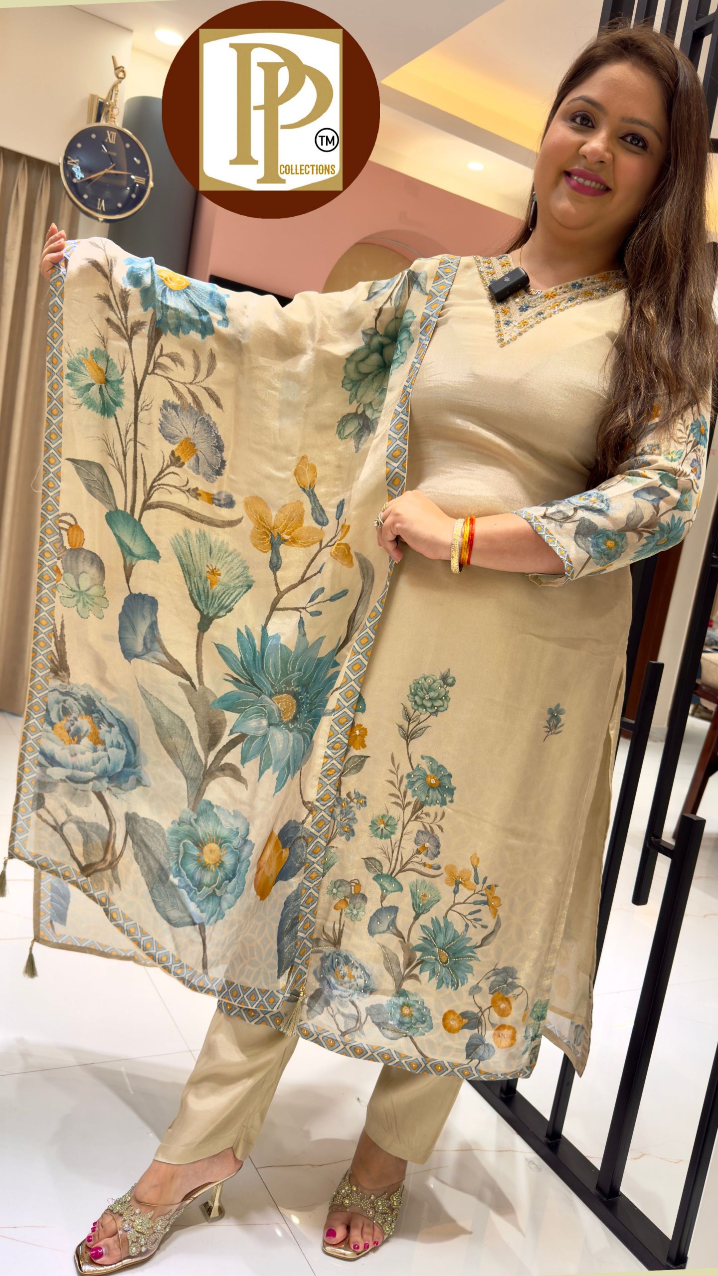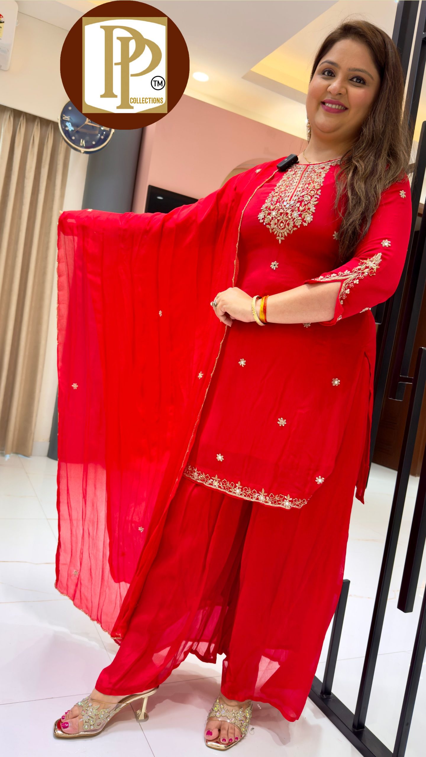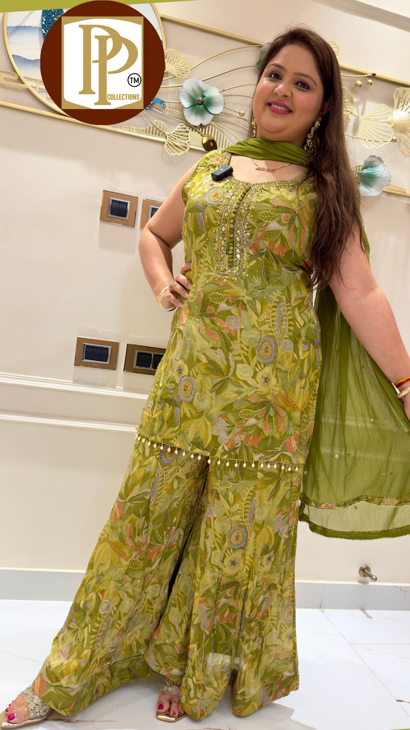 Description : 3piece Gharara Set Fabric Type : Chinnon Style : Kurti & Gharara Set Work Type : Printed On Sippy & Hand Work With Matching Dupatta.
