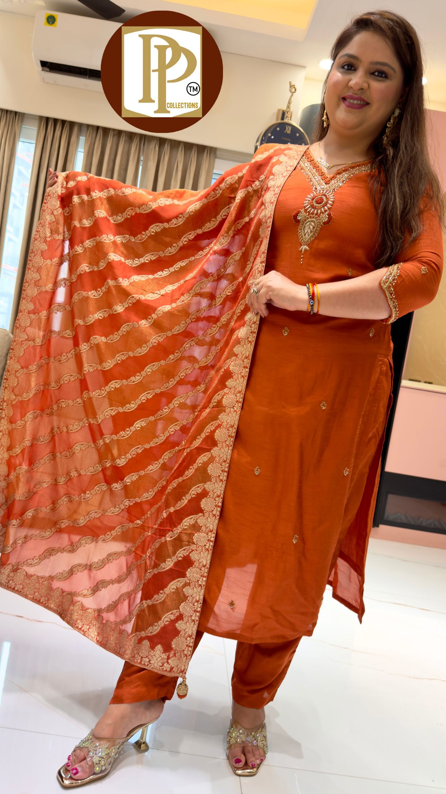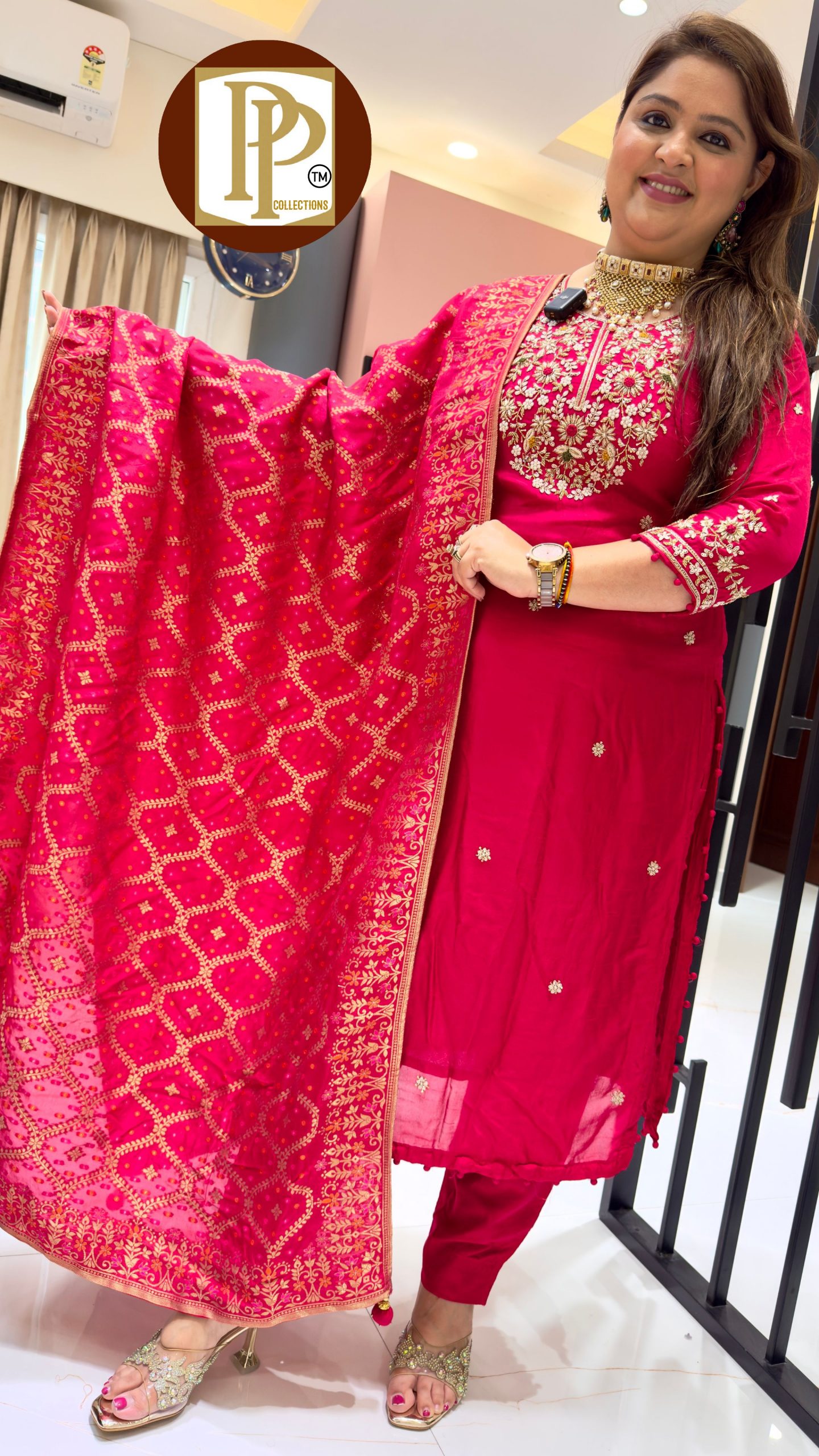 Description : 3piece kurti Pant Set Fabric Type : Dola Silk Style : Straight Suit Set Work Type : Havey Hand Work With Matching contrast Banarasi Dupatta.