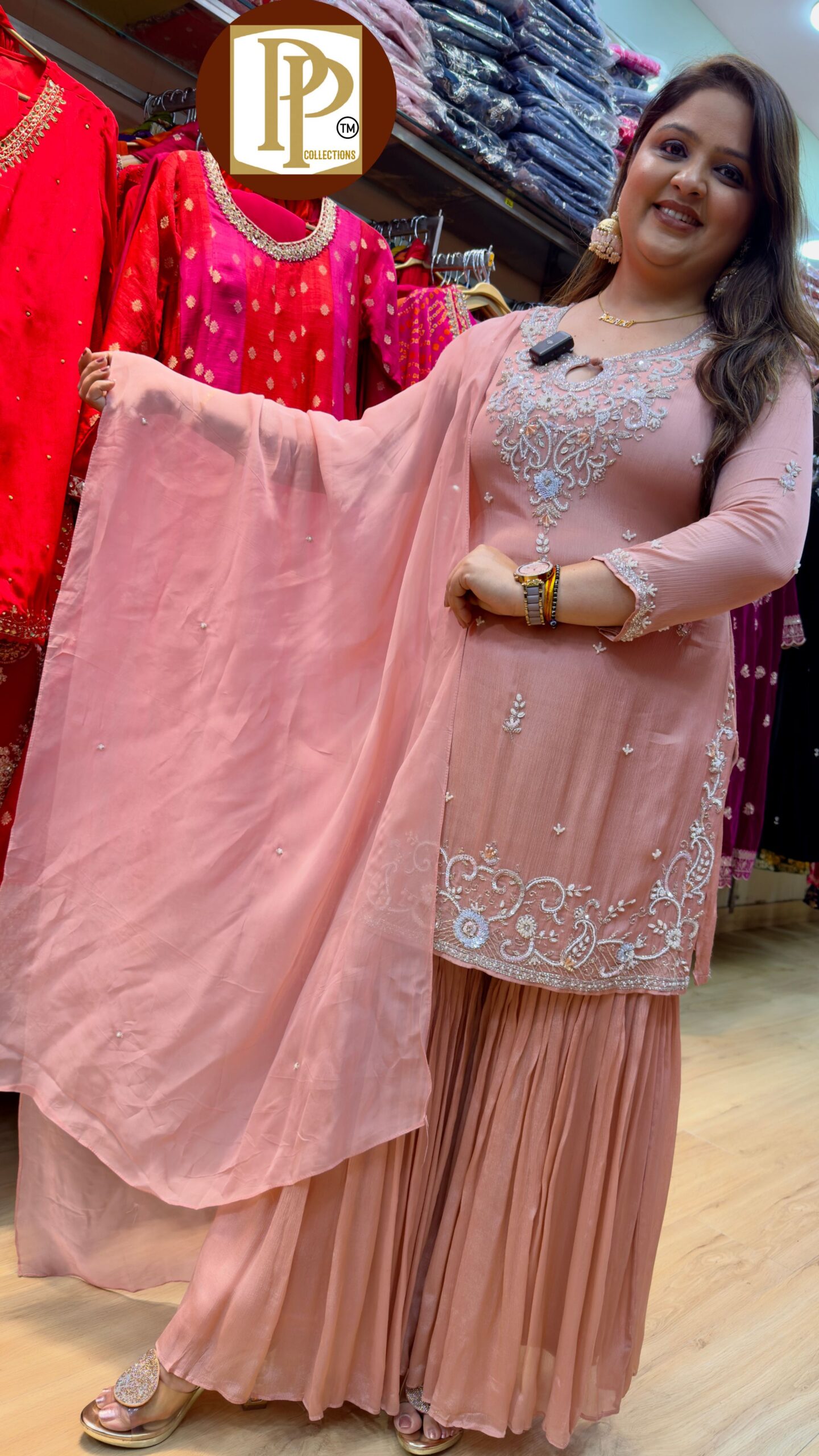 Description : 3 pcs Sharara Set Fabric Type : Chinnon Style : Short Kurti & Sharara Set Work Type : Heavy Hand Work With Matching Organza Dupatta.