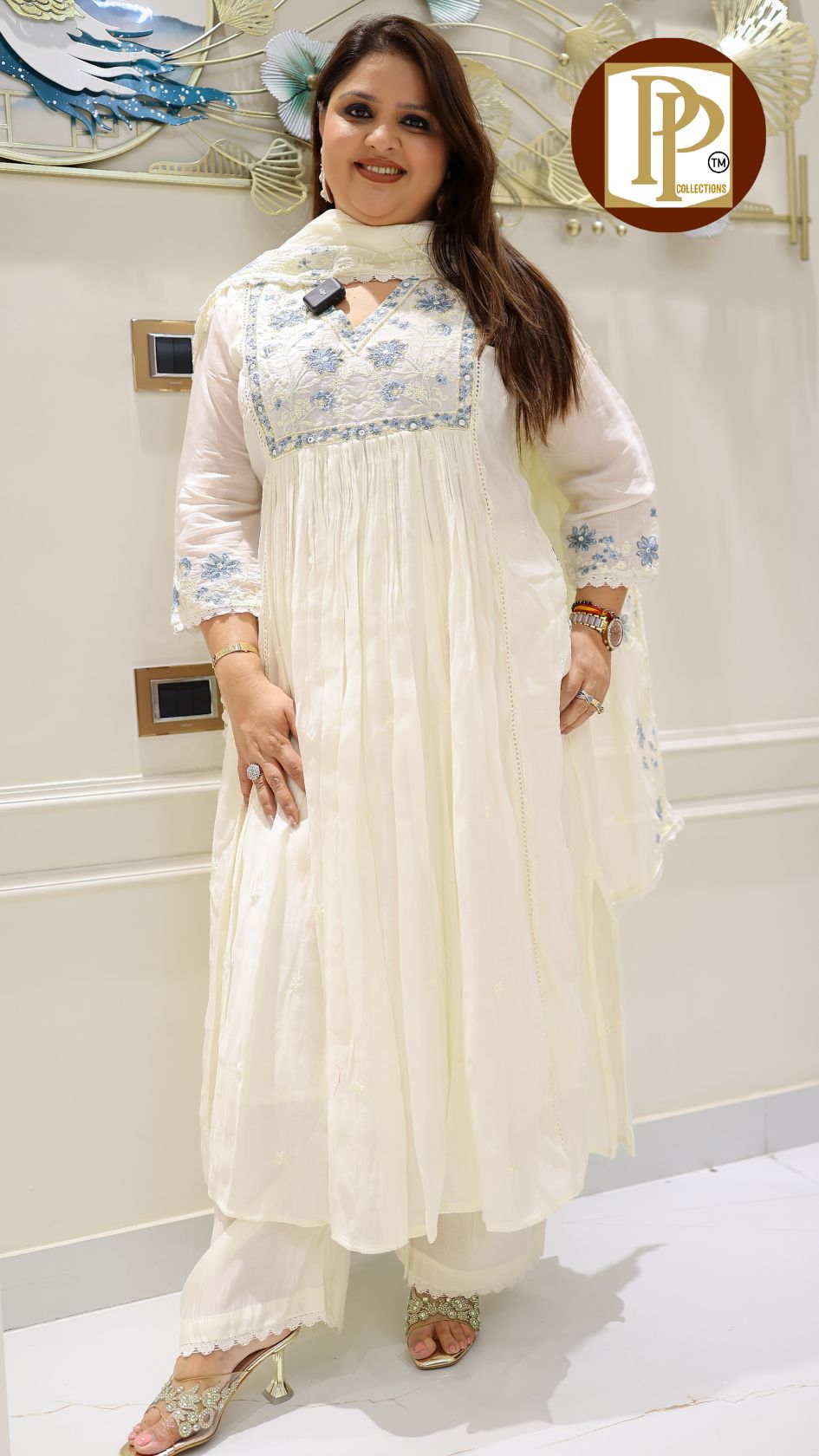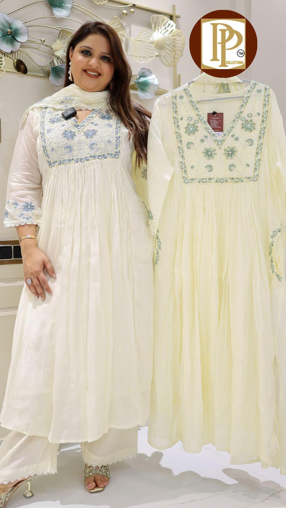 Description : 3pcs pant set Fabric Type : Cotton Style : aline kurta with pants Work Type : full heavy threadwork handwork in kurta & attached pocket with matching pants & dupatta. SA79 SA80