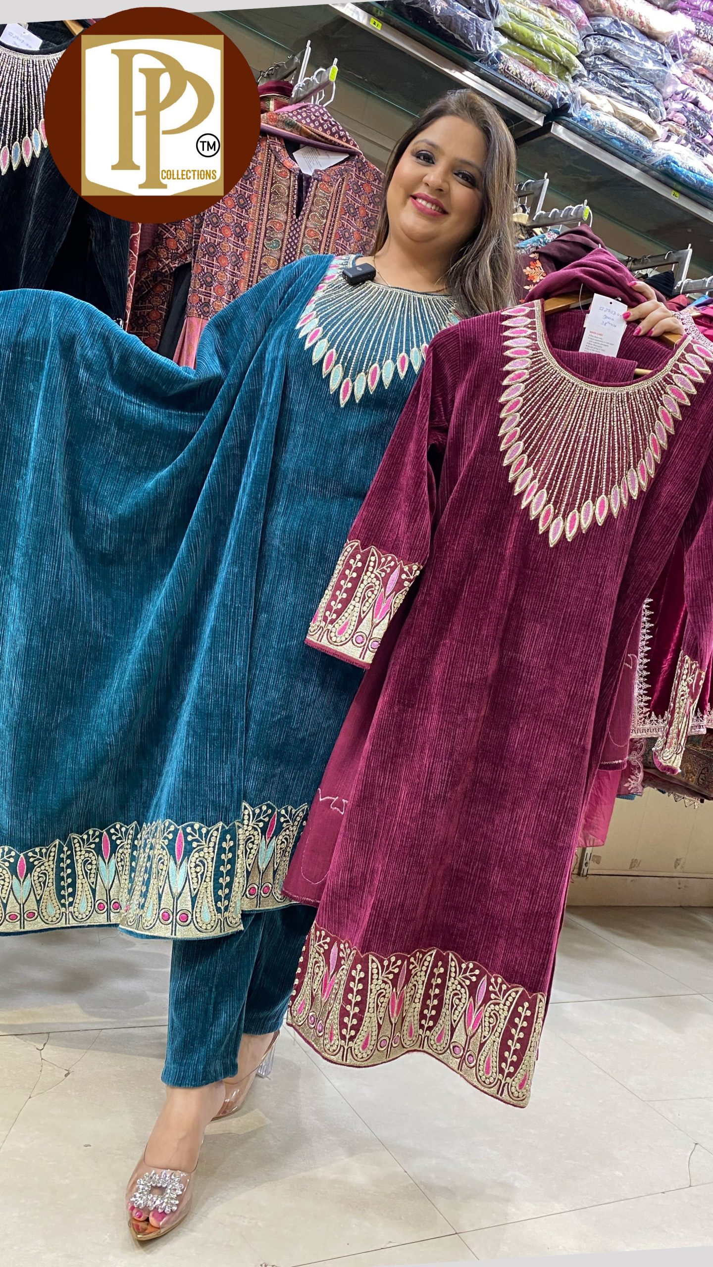 Description : 3piece Pant Set Fabric Type : Velvet Style : Stright Set Work Type : All Over Printed On Hand Work With Matching Shawl.