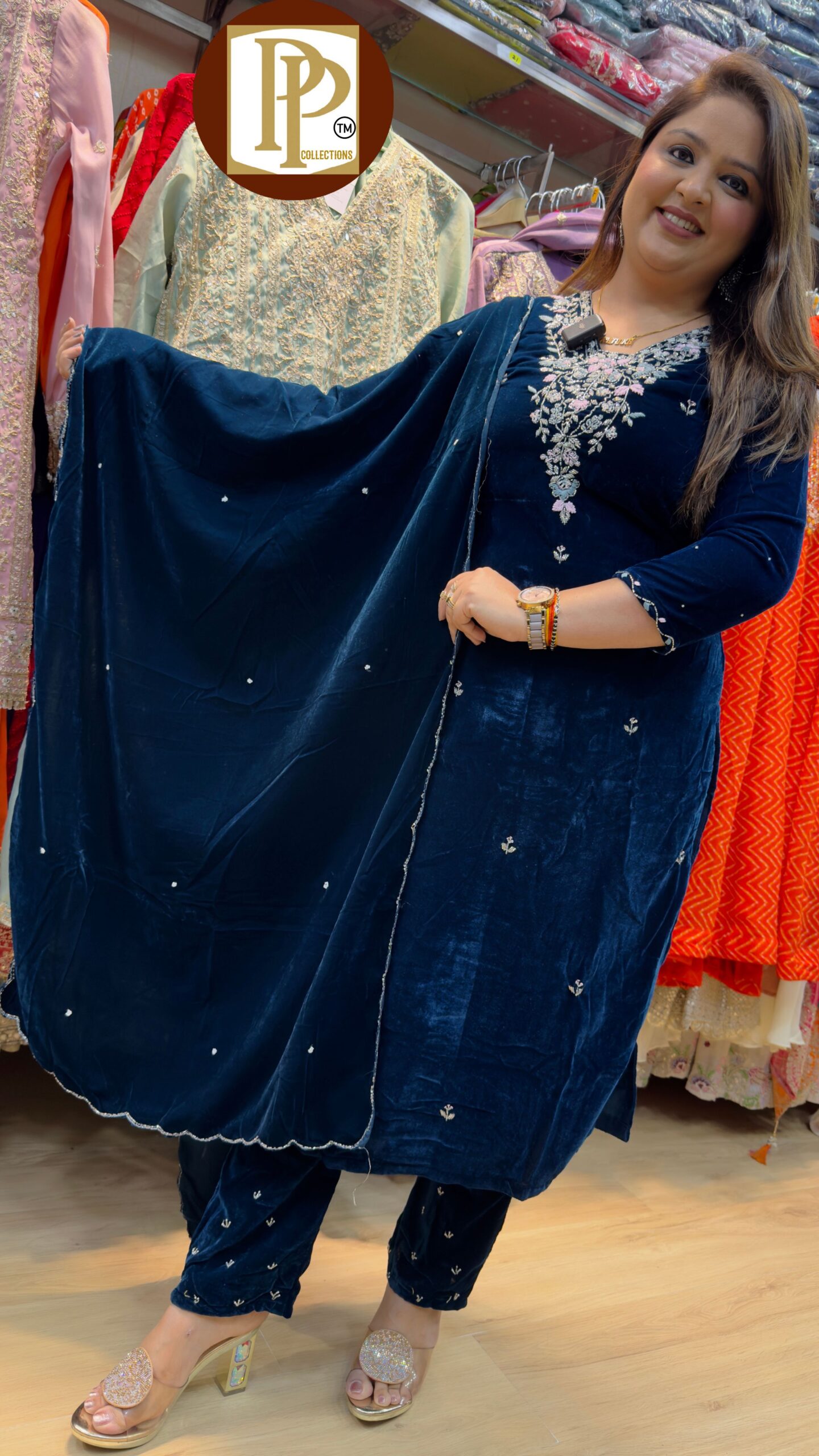 Description : 3pcs straight suit Fabric Type : velvet Style : kurti with pants Work Type : mirror work in kurti & matching printed dupatta.